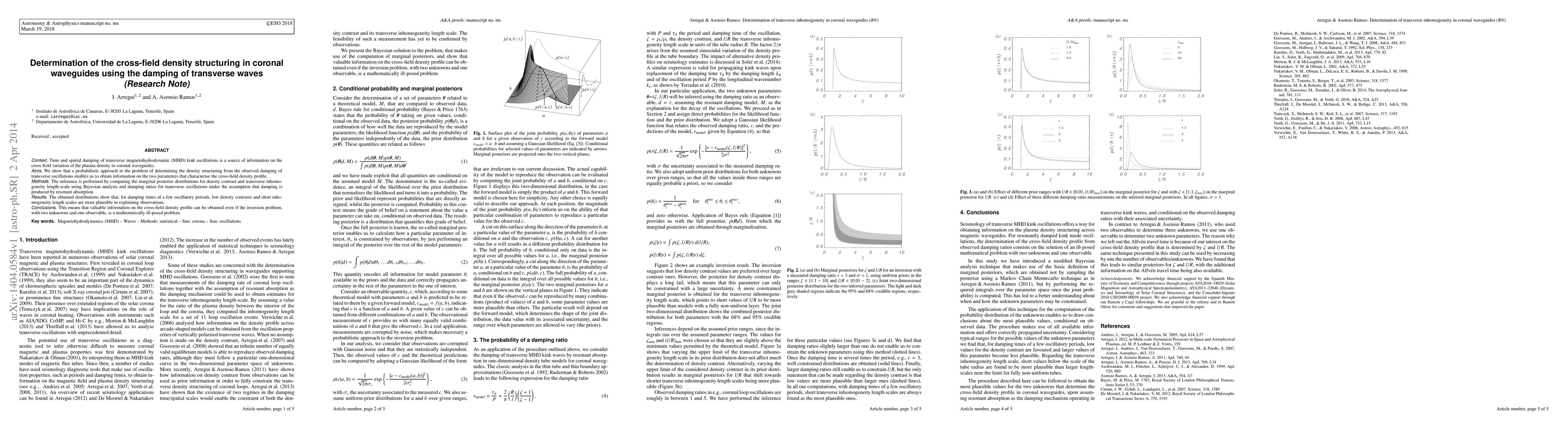 Time and spatial damping of transverse magnetohydrodynamic (MHD) kink oscillations is a source of information on the cross-field variation of the plasma density in coronal waveguides. We show that a probabilistic approach to the problem of determining the density structuring from the observed damping of transverse oscillations enables us to obtain information on the two parameters that characterise the cross-field density profile. The inference is performed by computing the marginal posterior distributions for density contrast and transverse inhomo- geneity length-scale using Bayesian analysis and damping ratios for transverse oscillations under the assumption that damping is produced by resonant absorption. The obtained distributions show that, for damping times of a few oscillatory periods, low density contrasts and short inho- mogeneity length scales are more plausible in explaining observations. This means that valuable information on the cross-field density profile can be obtained even if the inversion problem, with two unknowns and one observable, is a mathematically ill-posed problem.