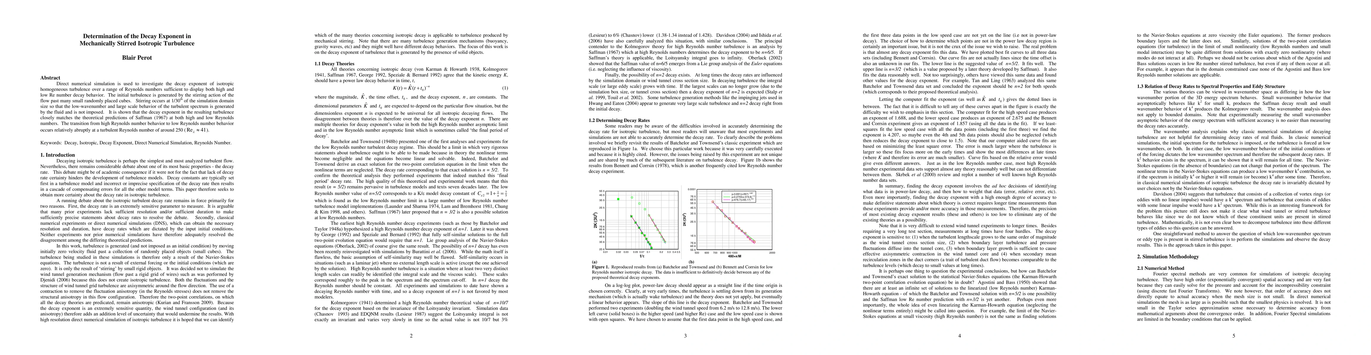 Direct numerical simulation is used to investigate the decay exponent of isotropic homogeneous turbulence over a range of Reynolds numbers sufficient to display both high and low Re number decay behavior. The initial turbulence is generated by the stirring action of the flow past many small randomly placed cubes. Stirring occurs at 1/30th of the simulation domain size so that the low-wavenumber and large scale behavior of the turbulent spectrum is generated by the fluid and is not imposed. It is shown that the decay exponent in the resulting turbulence closely matches the theoretical predictions of Saffman (1967) at both high and low Reynolds numbers. The transition from high Reynolds number behavior to low Reynolds number behavior occurs relatively abruptly at a turbulent Reynolds number of around 250.