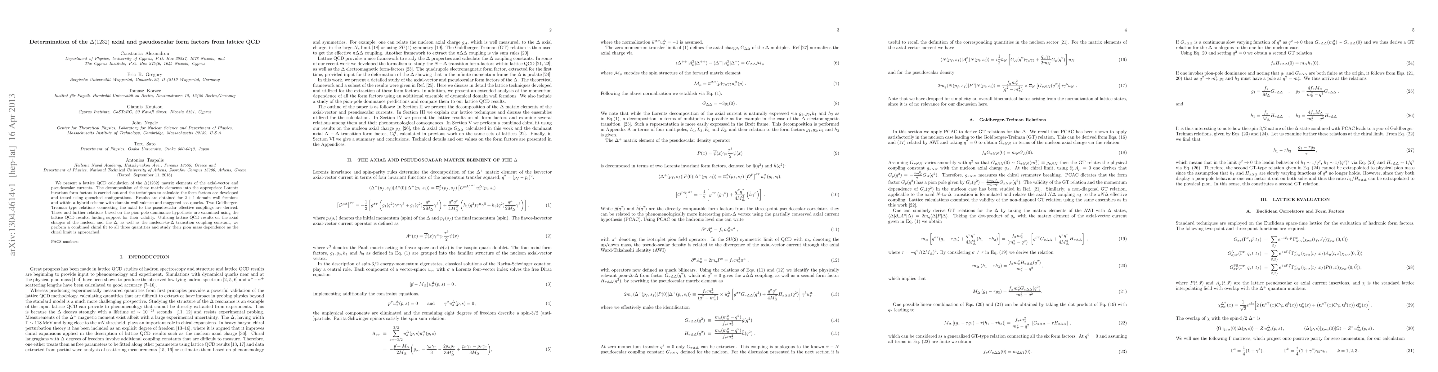 We present a lattice QCD calculation of the $\Delta(1232)$ matrix elements of the axial-vector and pseudoscalar currents. The decomposition of these matrix elements into the appropriate Lorentz invariant form factors is carried out and the techniques to calculate the form factors are developed and tested using quenched configurations. Results are obtained for 2+1 domain wall fermions and within a hybrid scheme with domain wall valence and staggered sea quarks. Two Goldberger-Treiman type relations connecting the axial to the pseudoscalar effective couplings are derived. These and further relations based on the pion-pole dominance hypothesis are examined using the lattice QCD results, finding support for their validity. Utilizing lattice QCD results on the axial charges of the nucleon and the $\Delta$, as well as the nucleon-to-$\Delta$ transition coupling constant, we perform a combined chiral fit to all three quantities and study their pion mass dependence as the chiral limit is approached.