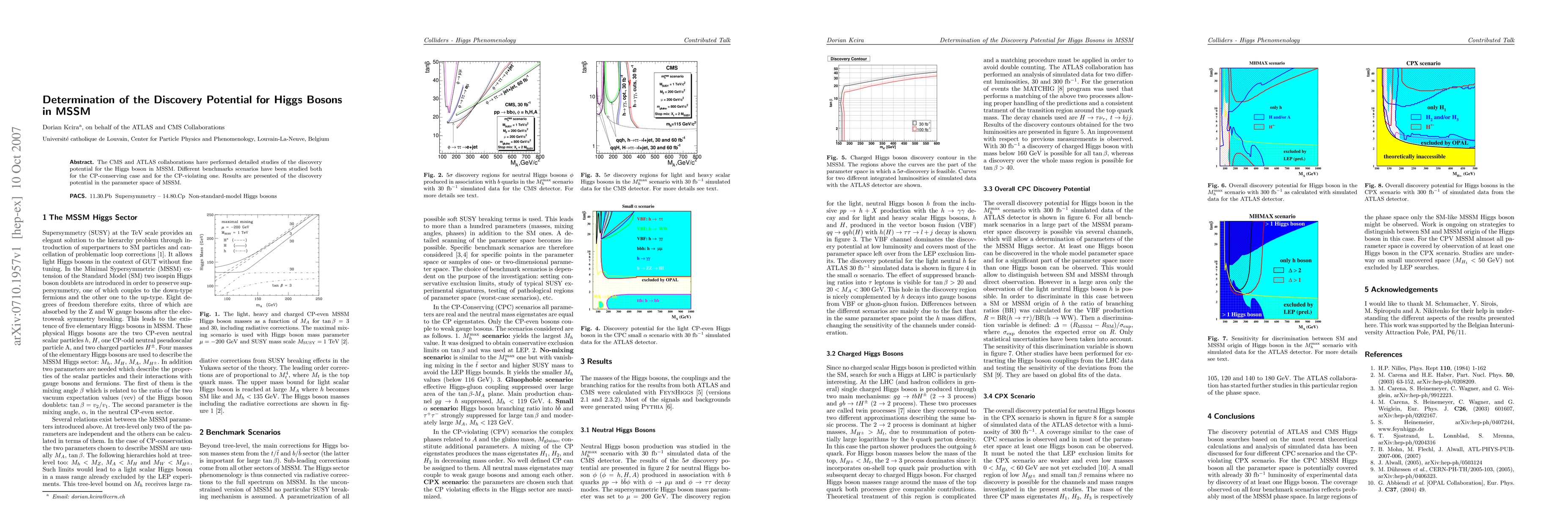 Researchers from CMS and ATLAS collaborations studied Higgs boson discovery potential in Minimal Supersymmetric Standard Model (MSSM) scenarios, presenting results on sensitivity to particle properties.