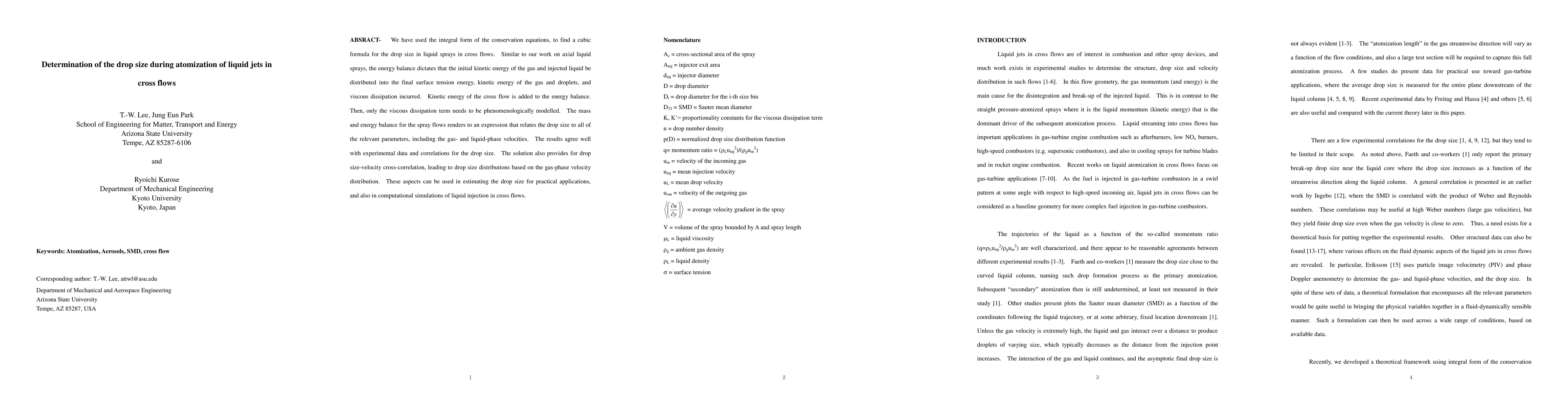 This paper develops a cubic formula for determining drop size in liquid sprays subjected to cross flows, using conservation equations and an energy balance. The model correlates drop size with gas and liquid velocities, validated by experimental data, and provides insights for practical applications and computational simulations.
