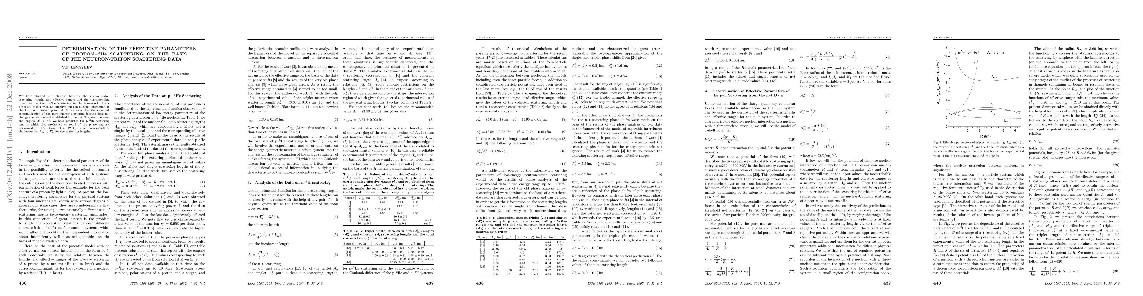 We have studied the relations between the neutron-triton scattering lengths and effective ranges and the corresponding quantities for the p --$^{3}$He scattering in the framework of the potential model with an effective nucleon-nucleus interaction in the form of a $\delta $-shell potential. It is shown that the Coulomb renormalization of the pure nuclear scattering lengths does not change the relation well established for the n + $^{3}$H system between the lengths: $A^{1} < A^{0}$. We have predicted the p--$^{3}$He scattering lengths which give preference to set I of the phase analysis performed by E.A. George et al. (2003), which corresponds to the inequality $A^{1}_{nc} < A^{0}_{nc}$ for the scattering lengths.