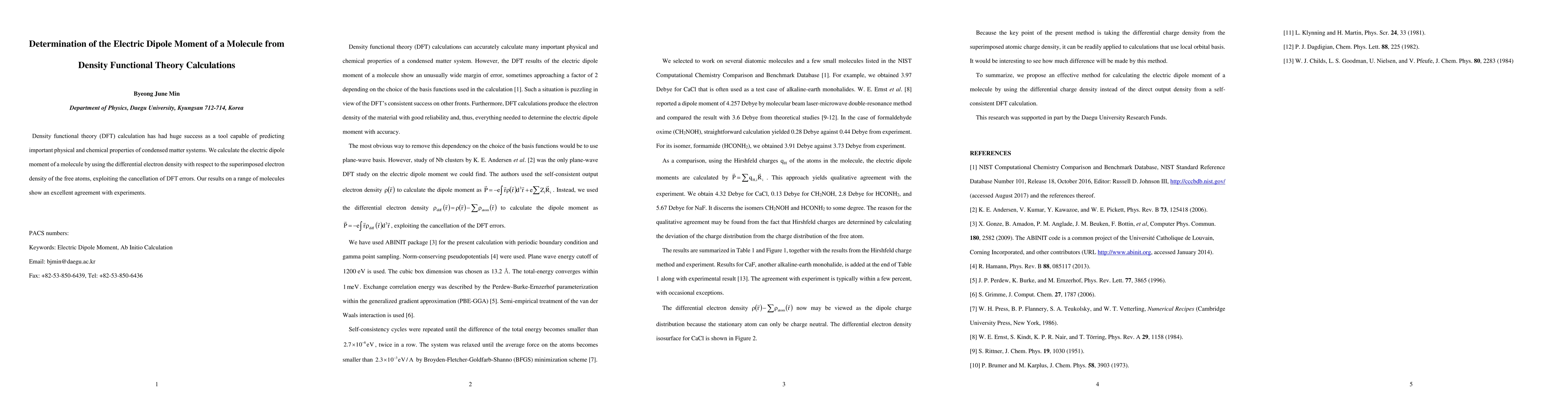 This paper utilizes density functional theory (DFT) to accurately determine the electric dipole moment of molecules by analyzing differential electron density, demonstrating high accuracy and agreement with experimental data.