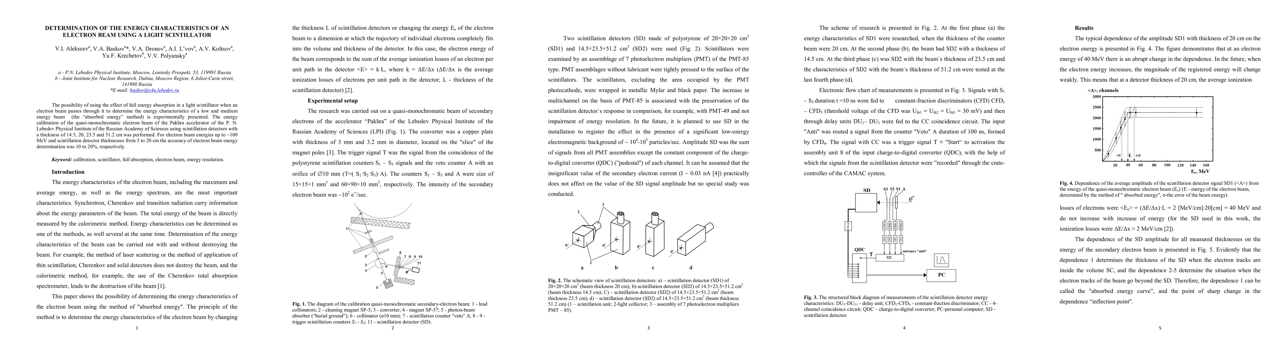 This paper experimentally investigates the use of light scintillators to determine the energy characteristics of low and medium energy electron beams through full energy absorption. The study calibrates a quasi-monochromatic electron beam from the Pakhra accelerator using scintillation detectors, achieving energy determination accuracy of 10-20% for beams up to 100 MeV.
