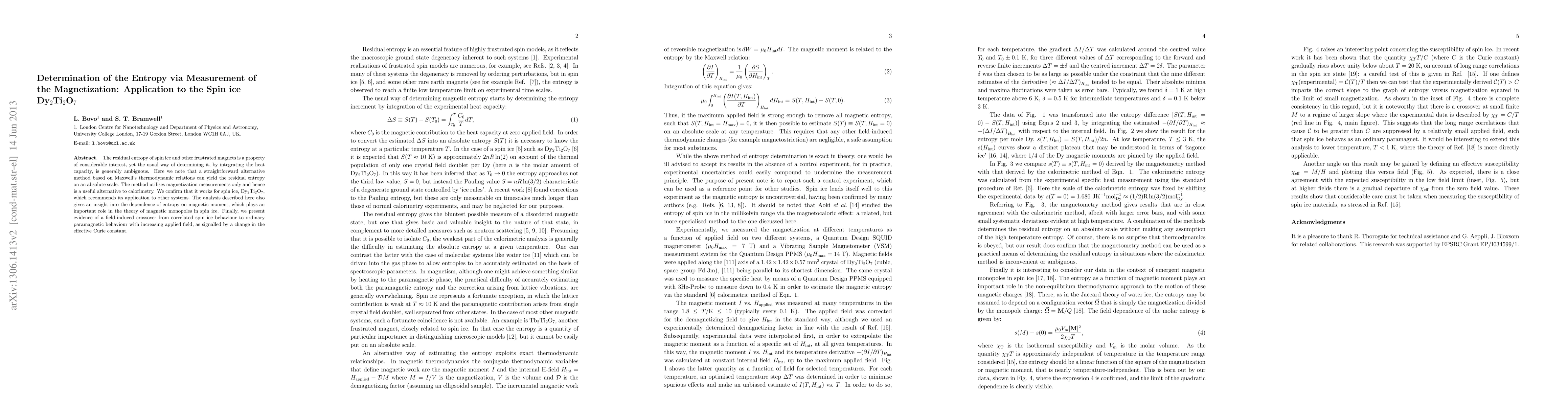 The residual entropy of spin ice and other frustrated magnets is a property of considerable interest, yet the usual way of determining it, by integrating the heat capacity, is generally ambiguous. Here we note that a straightforward alternative method based on Maxwell's thermodynamic relations can yield the residual entropy on an absolute scale. The method utilises magnetization measurements only and hence is a useful alternative to calorimetry. We confirm that it works for spin ice, Dy2Ti2O7, which recommends its application to other systems. The analysis described here also gives an insight into the dependence of entropy on magnetic moment, which plays an important role in the theory of magnetic monopoles in spin ice. Finally, we present evidence of a field-induced crossover from correlated spin ice behaviour to ordinary paramagnetic behaviour with increasing applied field, as signalled by a change in the effective Curie constant.