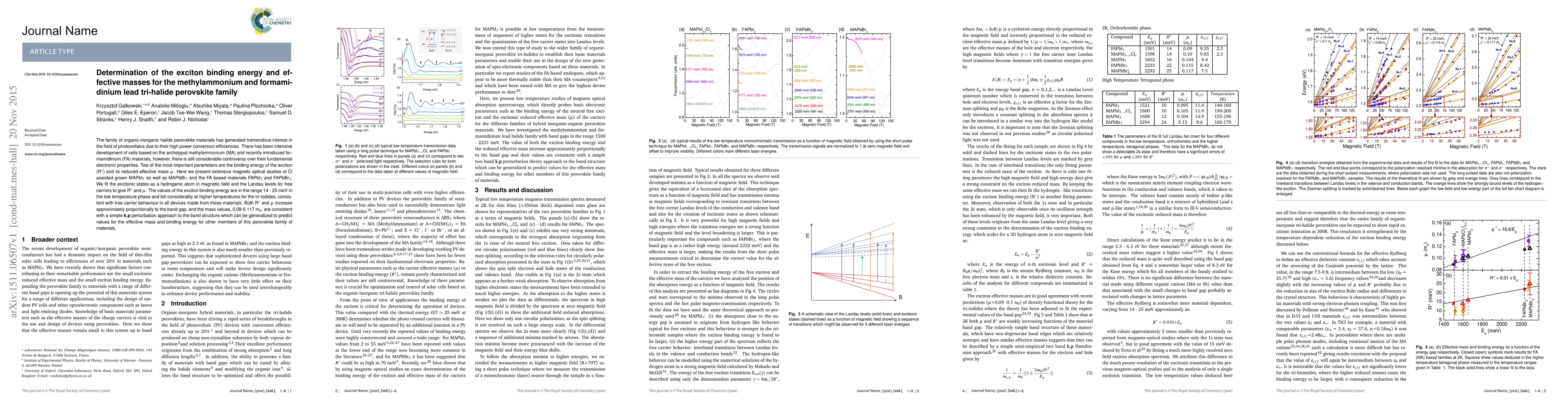 The family of organic-inorganic halide perovskite materials has generated tremendous interest in the field of photovoltaics due to their high power conversion efficiencies. There has been intensive development of cells based on the archetypal methylammonium (MA)and recently introduced formamidinium (FA) materials, however, there is still considerable controversy over their fundamental electronic properties. Two of the most important parameters are the binding energy of the exciton (R$^{*}$) and its reduced effective mass $\mu$. Here we present extensive magneto optical studies of Cl assisted grown MAPbI$_{3}$ as well as MAPbBr$_{3}$ and the FA based materials FAPbI$_{3}$ and FAPbBr$_{3}$. We fit the excitonic states as a hydrogenic atom in magnetic field and the Landau levels for free carriers to give R$^{*}$ and $\mu$. The values of the exciton binding energy are in the range 14 - 25 meV in the low temperature phase and fall considerably at higher temperatures for the tri-iodides, consistent with free carrier behaviour in all devices made from these materials. Both R$^{*}$ and $\mu$ increase approximately proportionally to the band gap, and the mass values, 0.09-0.117 m$_{0}$, are consistent with a simple \textbf{k.p} perturbation approach to the band structure which can be generalized to predict values for the effective mass and binding energy for other members of this perovskite family of materials.