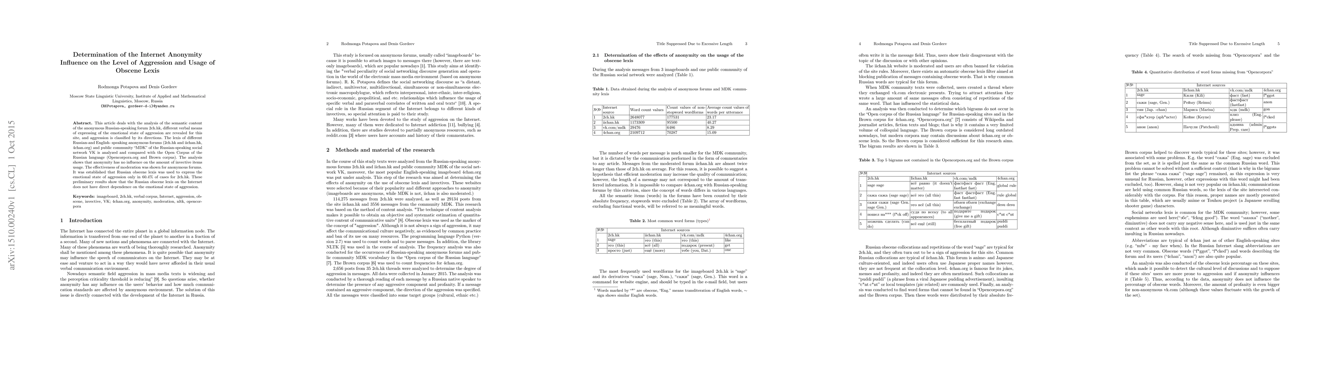 This article deals with the analysis of the semantic content of the anonymous Russian-speaking forum 2ch.hk, different verbal means of expressing of the emotional state of aggression are revealed for this site, and aggression is classified by its directions. The lexis of different Russian-and English- speaking anonymous forums (2ch.hk and iichan.hk, 4chan.org) and public community "MDK" of the Russian-speaking social network VK is analyzed and compared with the Open Corpus of the Russian language (Opencorpora.org and Brown corpus). The analysis shows that anonymity has no influence on the amount of invective items usage. The effectiveness of moderation was shown for anonymous forums. It was established that Russian obscene lexis was used to express the emotional state of aggression only in 60.4% of cases for 2ch.hk. These preliminary results show that the Russian obscene lexis on the Internet does not have direct dependence on the emotional state of aggression.