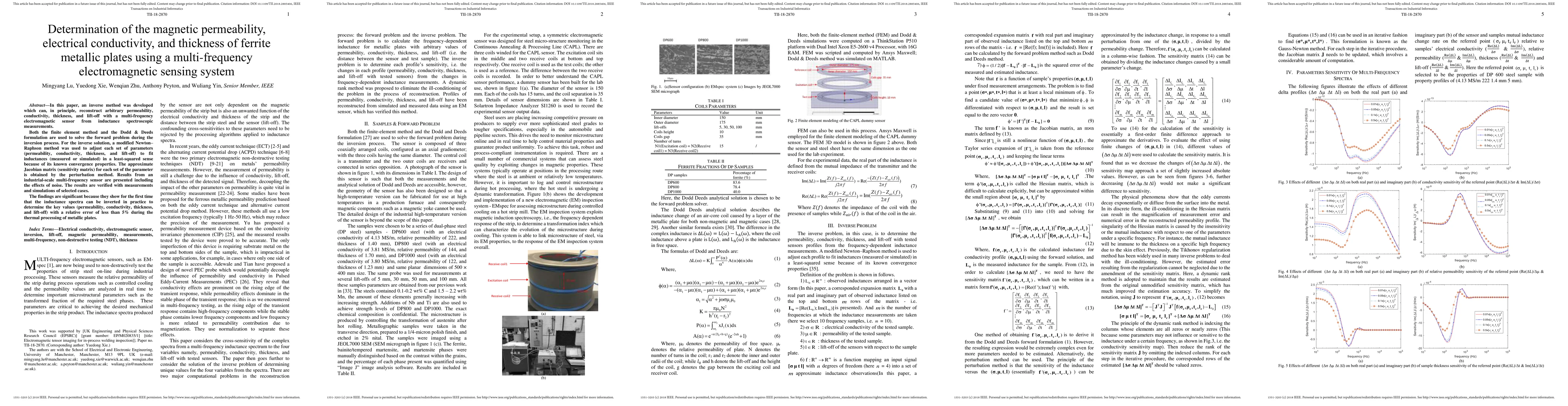 In this paper, an inverse method was developed which can, in principle, reconstruct arbitrary permeability, conductivity, thickness, and lift-off with a multi-frequency electromagnetic sensor from inductance spectroscopic measurements. The system fives the error of "Bad character(s) in field Abstract" for no reason. Please refer to manuscript for the full abstract.