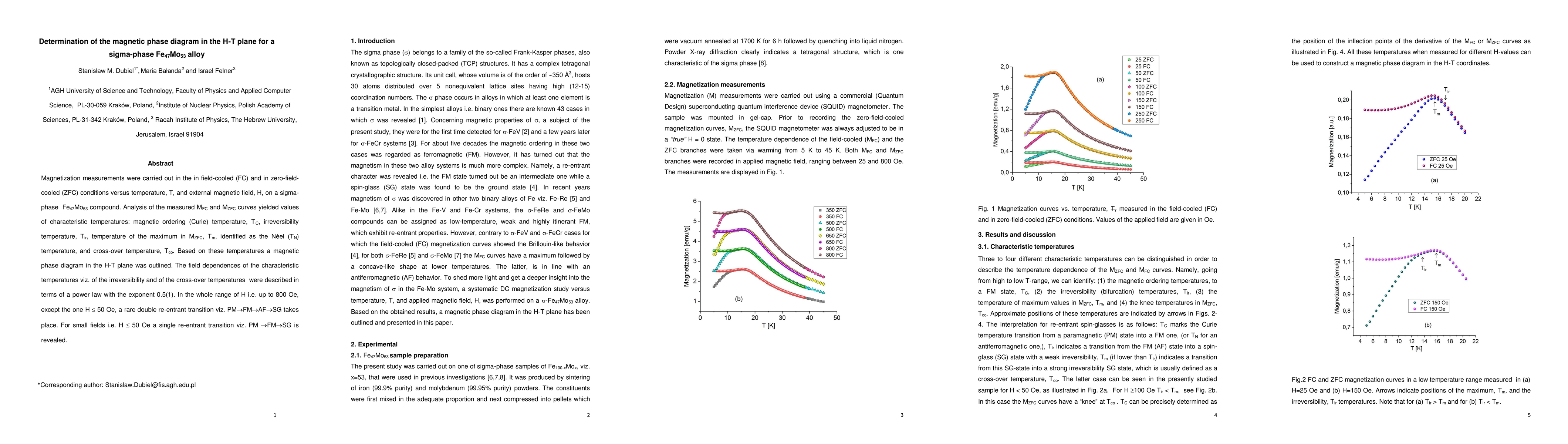 Magnetization measurements were carried out in the in field-cooled (FC) and in zero-field-cooled (ZFC) conditions versus temperature, T, and external magnetic field, H, on a sigma-phase Fe47Mo53 compound. Analysis of the measured M_FC and M_ZFC curves yielded values of characteristic temperatures: magnetic ordering (Curie) temperature, T_C, irreversibility temperature, T_ir, temperature of the maximum in M_ZFC, T_m, identified as the N\.eel (T_N) temperature, and cross-over temperature, T_co. Based on these temperatures a magnetic phase diagram in the H-T plane was outlined. The field dependences of the characteristic temperatures viz. of the irreversibility and of the cross-over temperatures were described in terms of a power law with the exponent 0.5(1). In the whole range of H i.e. up to 800 Oe, except the one H>50 Oe, a rare double re-entrant transition viz. PM-FM-AF-SG takes place. For small fields i.e. H<50 Oe a single re-entrant transition viz. PM-FM-SG is revealed.