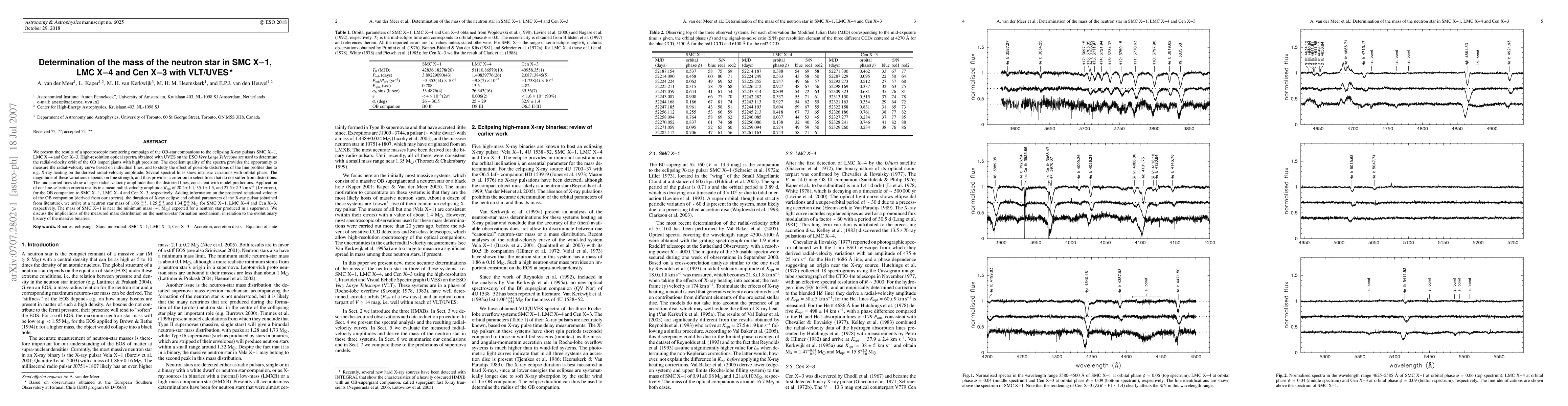 Researchers used high-resolution optical spectra to determine the masses of neutron star companions in three binary systems, SMC X-1, LMC X-4, and Cen X-3, with mass estimates ranging from 1.06 to 1.34 solar masses.