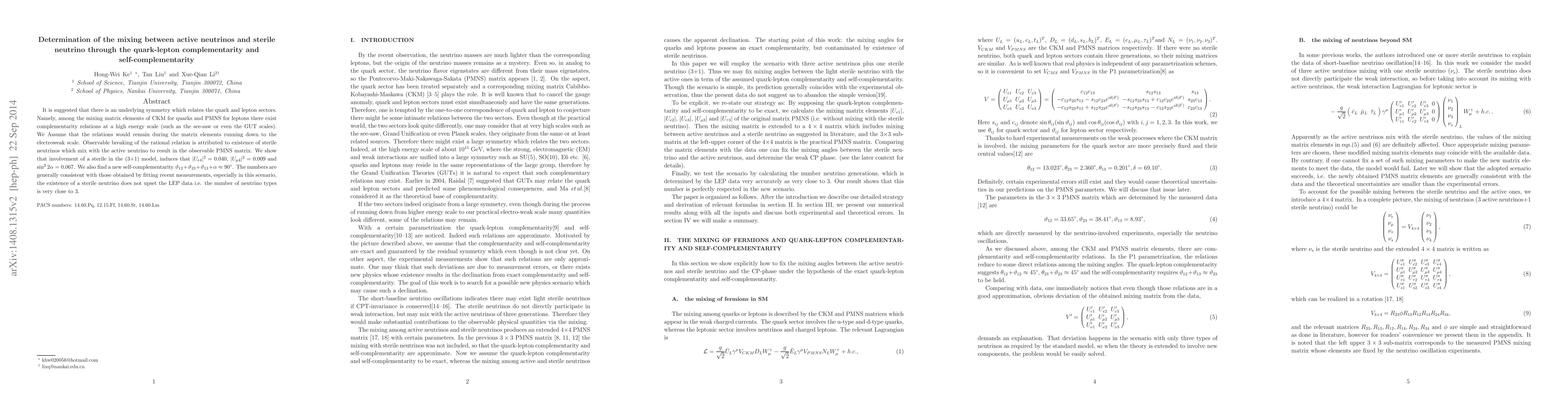It is suggested that there is an underlying symmetry which relates the quark and lepton sectors. Namely, among the mixing matrix elements of CKM for quarks and PMNS for leptons there exist complementarity relations at a high energy scale (such as the see-saw or even the GUT scales). Assuming that the relations would remain during the matrix elements running down to the EW scale. Observable breaking of the rational relation is attributed to existence of sterile neutrinos which mix with the active neutrino to result in the observable PMNS matrix. We show that involvement of a sterile in the (3+1) model, induces that $|U_{e4}|^2= 0.040$, $|U_{\mu4}|^2= 0.009$ and $\sin^2 2\alpha=0.067$. We also find a new self-complementarity $\vartheta_{12}+\vartheta_{23}+\vartheta_{13}+\alpha\approx90^\circ$. The numbers are generally consistent with those obtained by fitting recent measurements, especially in this scenario, the existence of a sterile neutrino does not upset the LEP data i.e. the number of neutrino types is very close to 3.