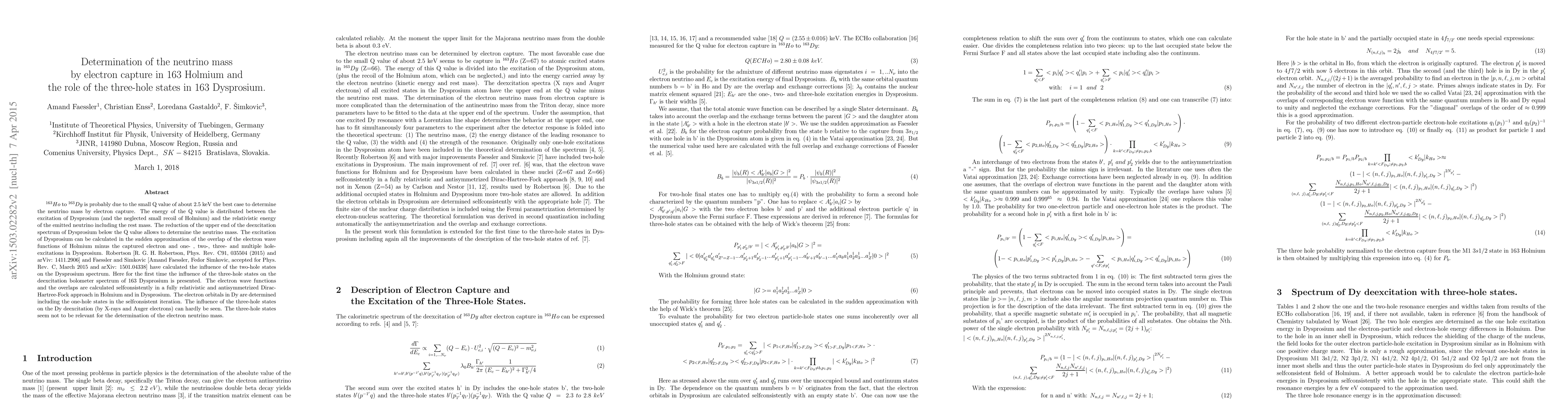 163 Holmium to 163 Dysprosium is probably due to the small Q value of about 2.5 keV the best case to determine the neutrino mass by electron capture. The energy of the Q value is distributed between the excitation of Dysprosium (and the neglected small recoil of Holmium) and the relativistic energy of the emitted neutrino including the restmass. The reduction of the upper end of the deexcitation spectrum of Dysprosium below the Q value allows to determine the neutrino mass. The excitation of Dysprosium can be calculated in the sudden approximation of the overlap of the electron wave functions of Holmium minus the captured electron and one-, two-, three- and multiple hole-excitations in Dysprosium. Robertson and the author have calculated the influence of the two-hole states on the Dysprosium deexitation spectrum. Here for the first time the influence of the three-hole states on the deexcitation bolometer spectrum of 163 Dysprosium is presented. The electron wave functions and the overlaps are calculated selfconsitently in a fully relativistic and antisymmetrized Dirac-Hartree-Fock approach in Holmium and in Dysprosium. The electron orbitals in Dysprosium are determined including the one-hole states in the selfconsistent iteration. The influence of the three-hole states on the deexcitation (by X-rays and Auger electrons) spectrum is hardly visible. The three-hole states seem not to be important for the determination of the neutrino mass.