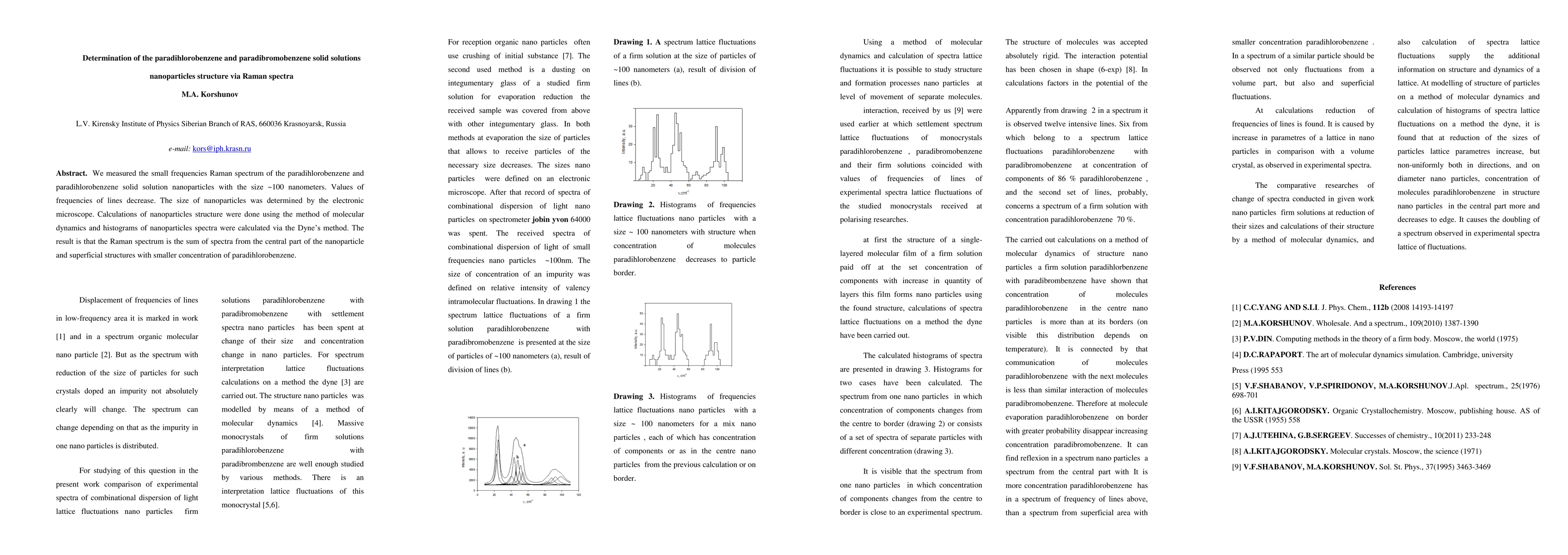 We measured the small frequencies Raman spectrum of the paradihlorobenzene and paradihlorobenzene solid solution nanoparticles with the size about 100 nanometers. Values of frequencies of lines decrease. The size of nanoparticles was determined by the electronic microscope. Calculations of nanoparticles structure were done using the method of molecular dynamics and histograms of nanoparticles spectra were calculated via the Dyne's method. The result is that the Raman spectrum is the sum of spectra from the central part of the nanoparticle and superficial structures with smaller concentration of paradihlorobenzene.