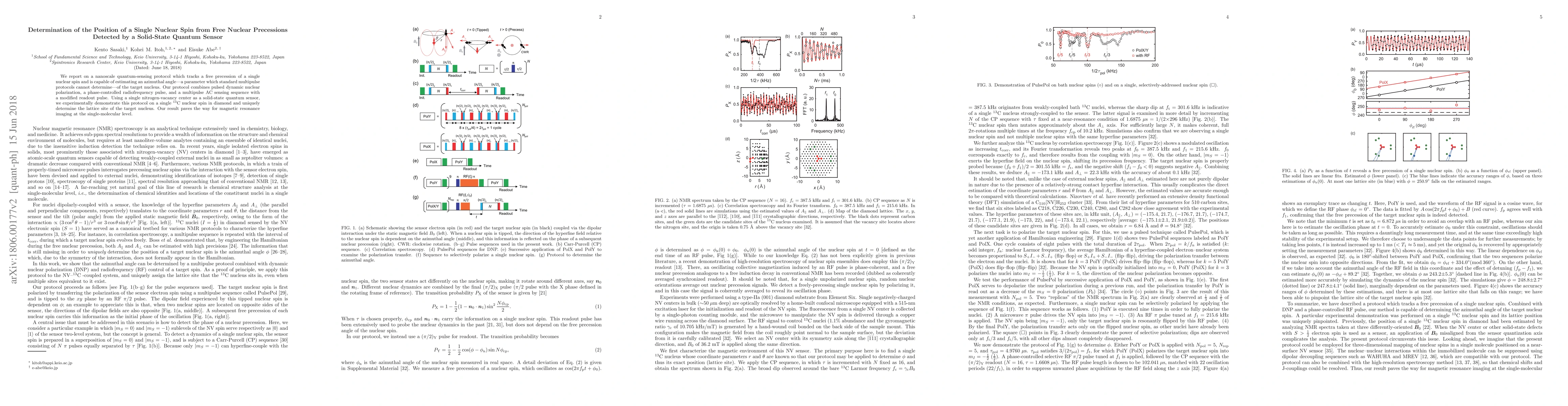 This paper presents a novel quantum-sensing protocol to determine the azimuthal angle of a single nuclear spin through free precession, using a nitrogen-vacancy center in diamond. The method combines advanced techniques to uniquely identify the lattice site of the target nucleus, potentially enabling single-molecular level magnetic resonance imaging.
