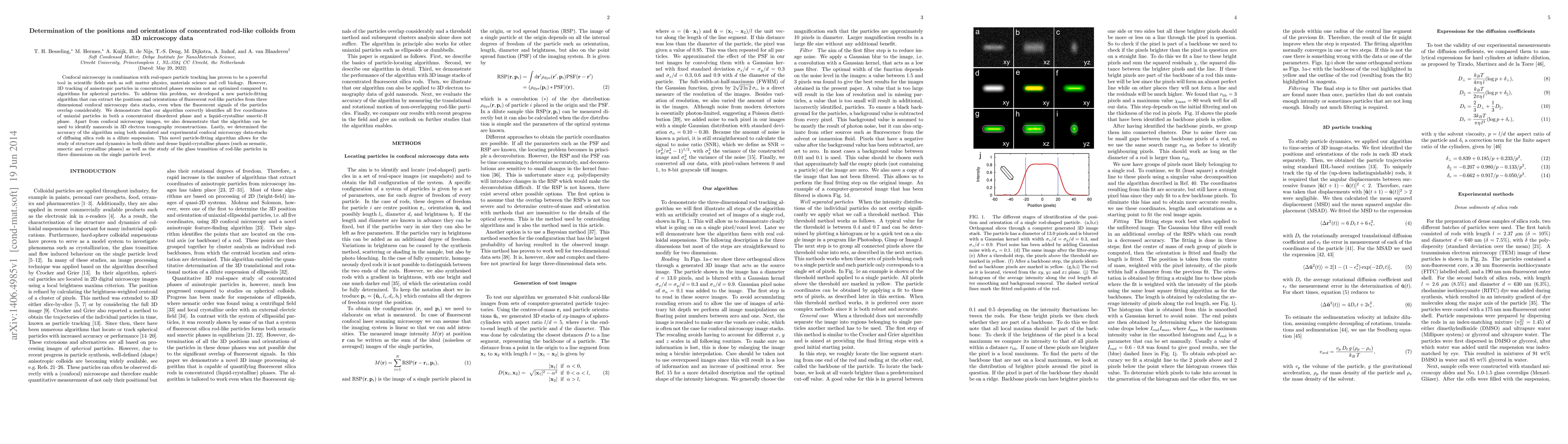 Confocal microscopy in combination with real-space particle tracking has proven to be a powerful tool in scientific fields such as soft matter physics, materials science and cell biology. However, 3D tracking of anisotropic particles in concentrated phases remains not as optimized compared to algorithms for spherical particles. To address this problem, we developed a new particle-fitting algorithm that can extract the positions and orientations of fluorescent rod-like particles from three dimensional confocal microscopy data stacks, even when the fluorescent signals of the particles overlap considerably. We demonstrate that our algorithm correctly identifies all five coordinates of uniaxial particles in both a concentrated disordered phase and a liquid-crystalline smectic-B phase. Apart from confocal microscopy images, we also demonstrate that the algorithm can be used to identify nanorods in 3D electron tomography reconstructions. Lastly, we determined the accuracy of the algorithm using both simulated and experimental confocal microscopy data-stacks of diffusing silica rods in a dilute suspension. This novel particle-fitting algorithm allows for the study of structure and dynamics in both dilute and dense liquid-crystalline phases (such as nematic, smectic and crystalline phases) as well as the study of the glass transition of rod-like particles in three dimensions on the single particle level.