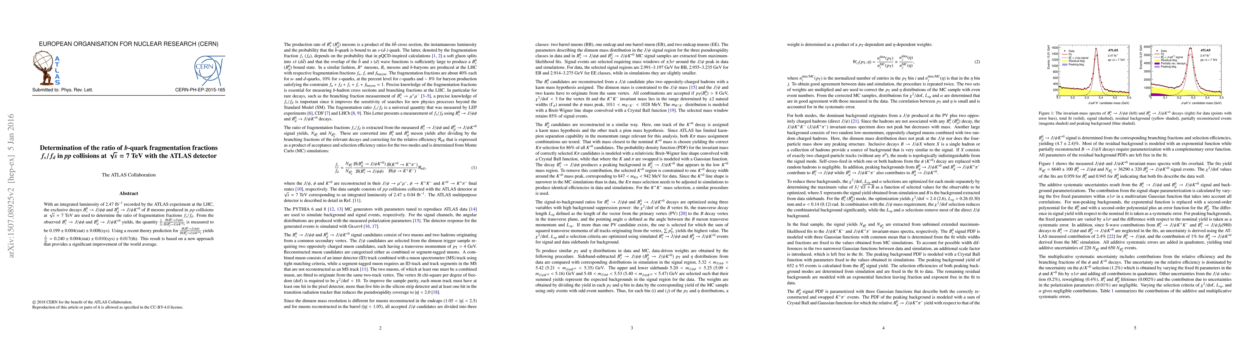 With an integrated luminosity of 2.47 fb$^{-1}$ recorded by the ATLAS experiment at the LHC, the exclusive decays $B_{s}^{0}\rightarrow J/\psi\phi$ and $B_{d}^{0}\rightarrow J/\psi K^{*0}$ of $B$ mesons produced in $pp$ collisions at $\sqrt{s}=7$ TeV are used to determine the ratio of fragmentation fractions $f_s/f_d$. From the observed $B_{s}^{0}\rightarrow J/\psi\phi$ and $B_{d}^{0}\rightarrow J/\psi K^{*0}$ yields, the quantity $\frac{f_s}{f_d}\frac{\mathcal{B}(B_{s}^{0} \rightarrow J/\psi \phi)}{\mathcal{B}(B_{d}^{0} \rightarrow J/\psi K^{*0})}$ is measured to be 0.199 $\pm$ 0.004(stat) $\pm$ 0.008(sys). Using a recent theory prediction for $\frac{\mathcal{B}(B_{s}^{0}\rightarrow J/\psi\phi)}{\mathcal{B}(B_{d}^{0}\rightarrow J/\psi K^{*0})}$ yields $\frac{f_s}{f_d} =$ 0.240 $\pm$ 0.004(stat) $\pm$ 0.010(sys) $\pm$ 0.017(th). This result is based on a new approach that provides a significant improvement of the world average.