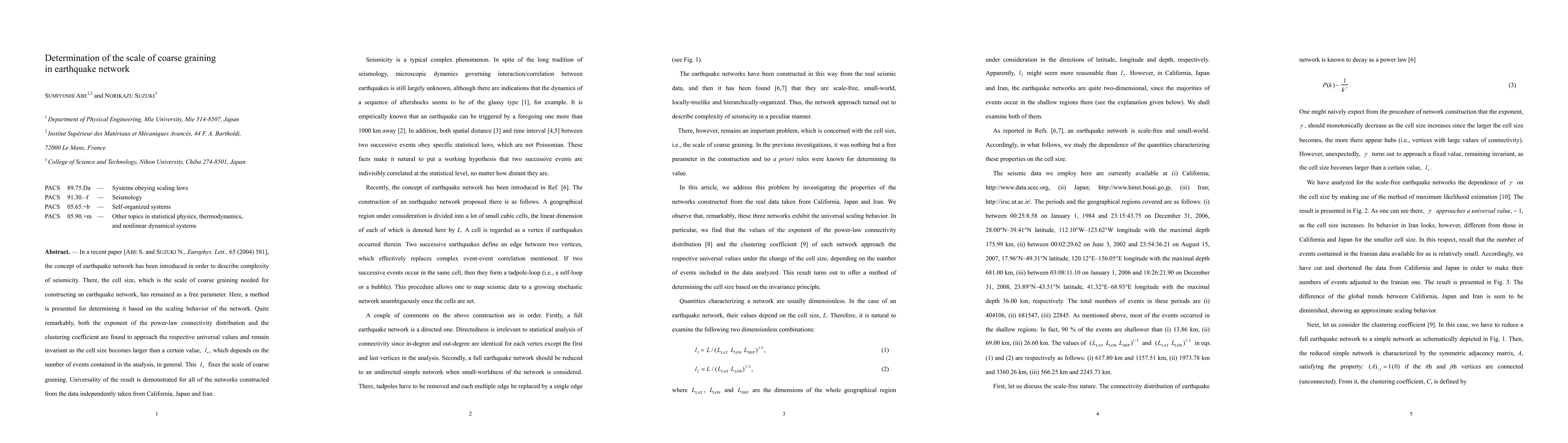 In a recent paper [S. Abe and N. Suzuki, Europhys. Lett., 65 (2004) 581], the concept of earthquake network has been introduced in order to describe complexity of seismicity. There, the cell size, which is the scale of coarse graining needed for constructing an earthquake network, has remained as a free parameter. Here, a method is presented for determining it based on the scaling behavior of the network. Quite remarkably, both the exponent of the power-law connectivity distribution and the clustering coefficient are found to approach the respective universal values and remain invariant as the cell size becomes larger than a certain value, $l_*$, which depends on the number of events contained in the analysis, in general. This $l_*$ fixes the scale of coarse graining. Universality of the result is demonstrated for all of the networks constructed from the data independently taken from California, Japan and Iran.