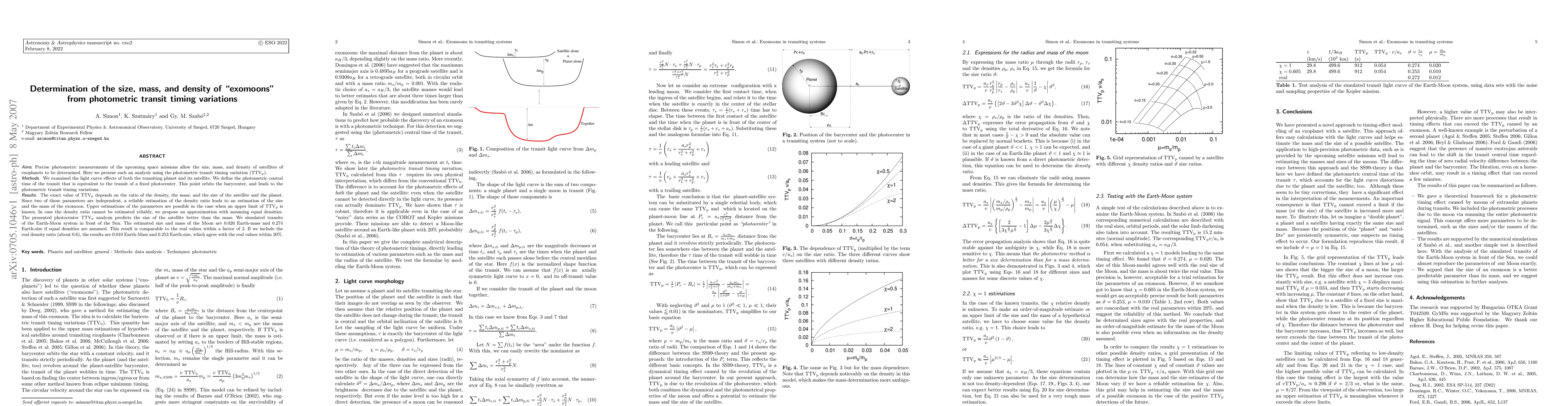 Precise photometric measurements of the upcoming space missions allow the size, mass, and density of satellites of exoplanets to be determined. Here we present such an analysis using the photometric transit timing variation ($TTV_p$). We examined the light curve effects of both the transiting planet and its satellite. We define the photometric central time of the transit that is equivalent to the transit of a fixed photocenter. This point orbits the barycenter, and leads to the photometric transit timing variations. The exact value of $TTV_p$ depends on the ratio of the density, the mass, and the size of the satellite and the planet. Since two of those parameters are independent, a reliable estimation of the density ratio leads to an estimation of the size and the mass of the exomoon. Upper estimations of the parameters are possible in the case when an upper limit of $TTV_p$ is known. In case the density ratio cannot be estimated reliably, we propose an approximation with assuming equal densities. The presented photocenter $TTV_p$ analysis predicts the size of the satellite better than the mass. We simulated transits of the Earth-Moon system in front of the Sun. The estimated size and mass of the Moon are 0.020 Earth-mass and 0.274 Earth-size if equal densities are assumed. This result is comparable to the real values within a factor of 2. If we include the real density ratio (about 0.6), the results are 0.010 Earth-Mass and 0.253 Earth-size, which agree with the real values within 20%.