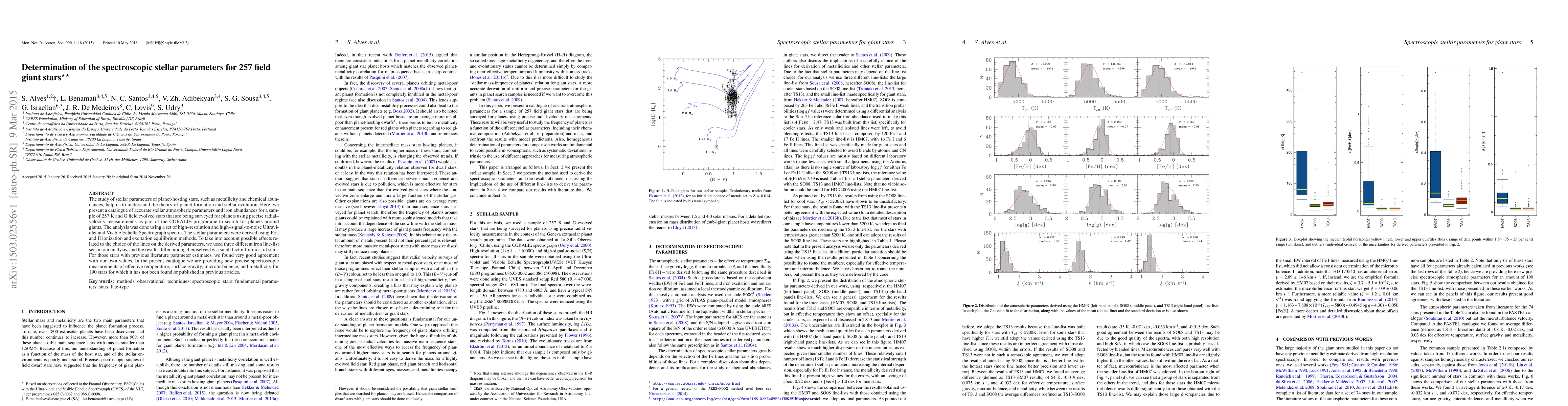 The study of stellar parameters of planet-hosting stars, such as metallicity and chemical abundances, help us to understand the theory of planet formation and stellar evolution. Here, we present a catalogue of accurate stellar atmospheric parameters and iron abundances for a sample of 257 K and G field evolved stars that are being surveyed for planets using precise radial--velocity measurements as part of the CORALIE programme to search for planets around giants. The analysis was done using a set of high--resolution and high--signal-to-noise Ultraviolet and Visible Echelle Spectrograph spectra. The stellar parameters were derived using Fe I and II ionization and excitation equilibrium methods. To take into account possible effects related to the choice of the lines on the derived parameters, we used three different iron line-list sets in our analysis, and the results differ among themselves by a small factor for most of stars. {For those stars with previous literature parameter estimates, we found very good agreement with our own values.} In the present catalogue we are providing new precise spectroscopic measurements of effective temperature, surface gravity, microturbulence, and metallicity for 190 stars for which it has not been found or published in previous articles.