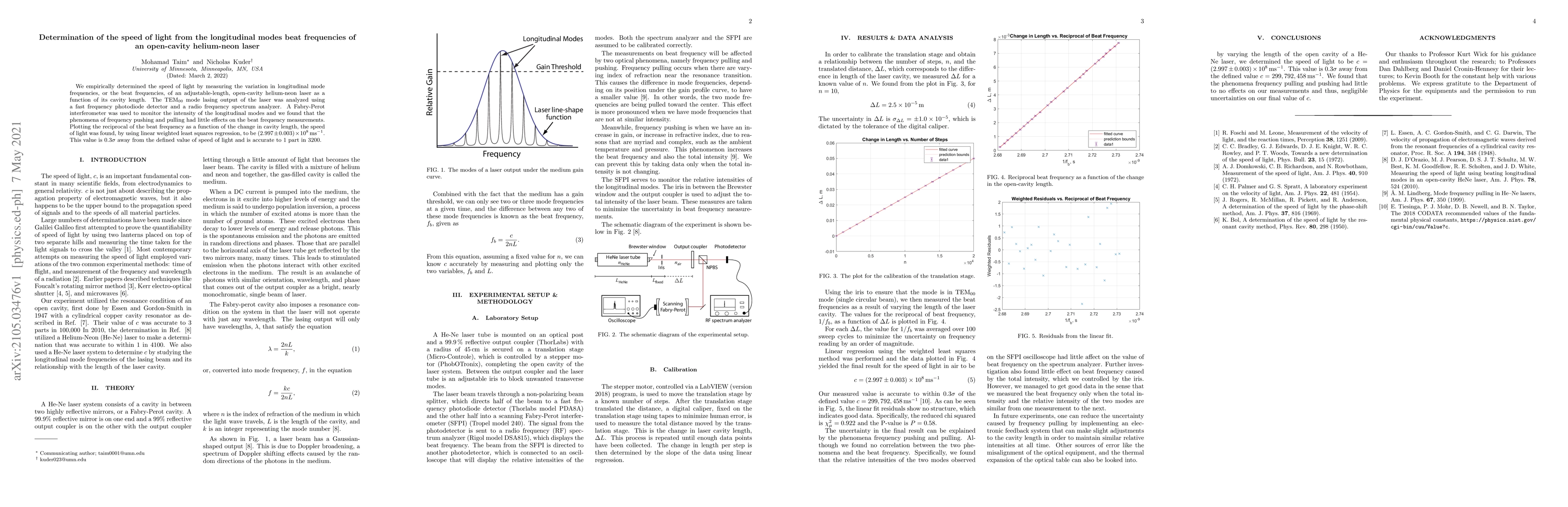 This paper empirically determined the speed of light by measuring beat frequencies from an open-cavity helium-neon laser's longitudinal modes, finding $(2.997 \pm 0.003) \times 10^{8}$ ms$^{-1}$, accurate to 1 part in 3200 and $0.3 \sigma$ from the defined value.