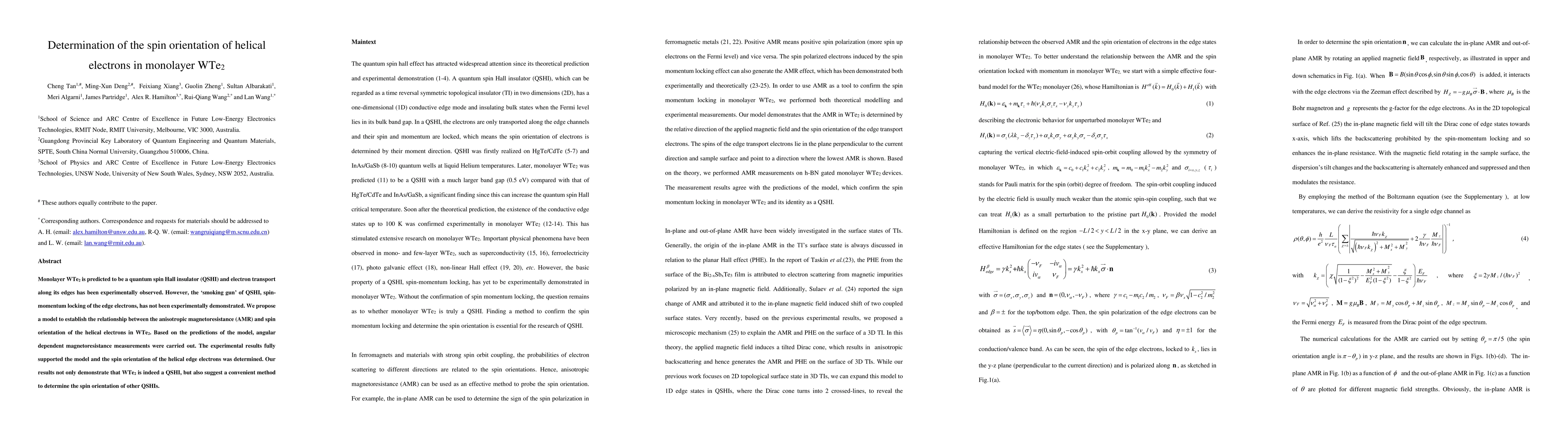 Monolayer WTe2 is predicted to be a quantum spin Hall insulator (QSHI) and electron transport along its edges has been experimentally observed. However, the 'smoking gun' of QSHI, spin momentum locking of the edge electrons, has not been experimentally demonstrated. We propose a model to establish the relationship between the anisotropic magnetoresistance (AMR) and spin orientation of the helical electrons in WTe2. Based on the predictions of the model, angular dependent magnetoresistance measurements were carried out. The experimental results fully supported the model and the spin orientation of the helical edge electrons was determined. Our results not only demonstrate that WTe2 is indeed a QSHI, but also suggest a convenient method to determine the spin orientation of other QSHIs.
