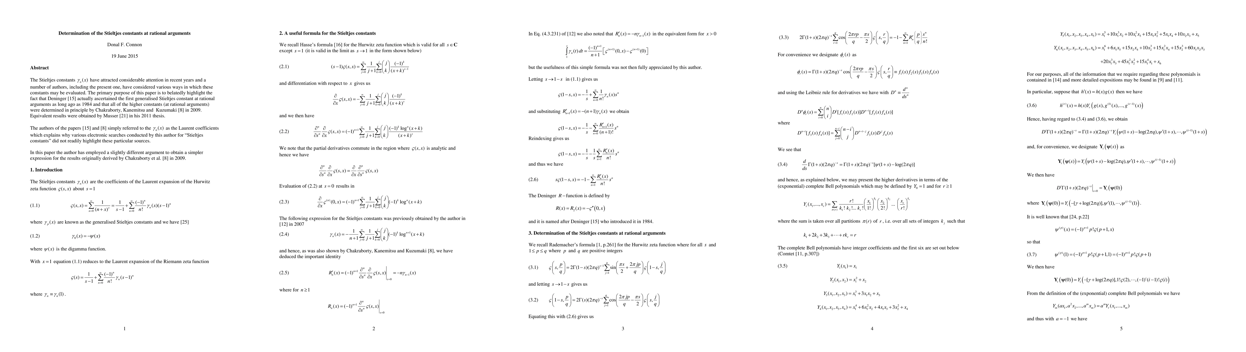 This paper revisits the determination of Stieltjes constants at rational arguments, highlighting that Deninger first identified these constants in 1984 and that subsequent work by Chakraborty, Kanemitsu, and Kuzumaki in 2009, along with Musser's 2011 thesis, completed the evaluation. The author presents a simpler expression for these results using a different approach.