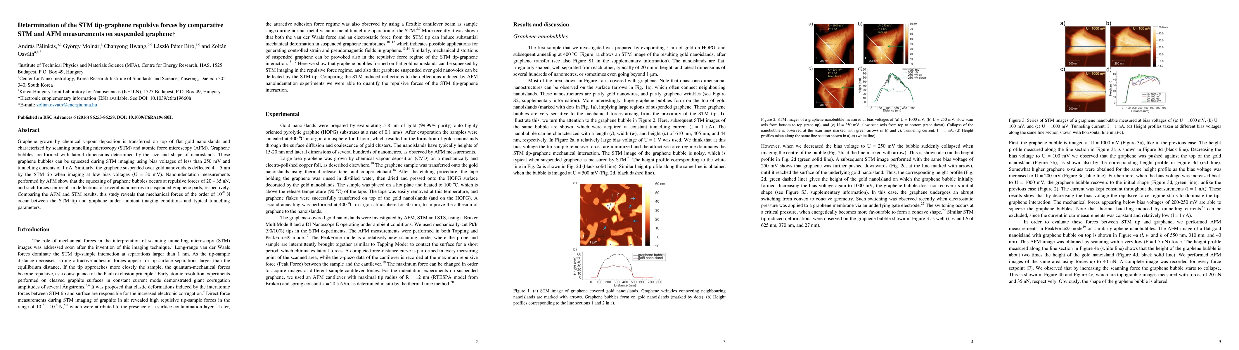 This study uses STM and AFM to determine the repulsive forces between an STM tip and suspended graphene, finding that forces of 20-35 nN cause graphene bubbles to squeeze, while AFM measurements reveal forces of 10^-8 N under typical imaging conditions.