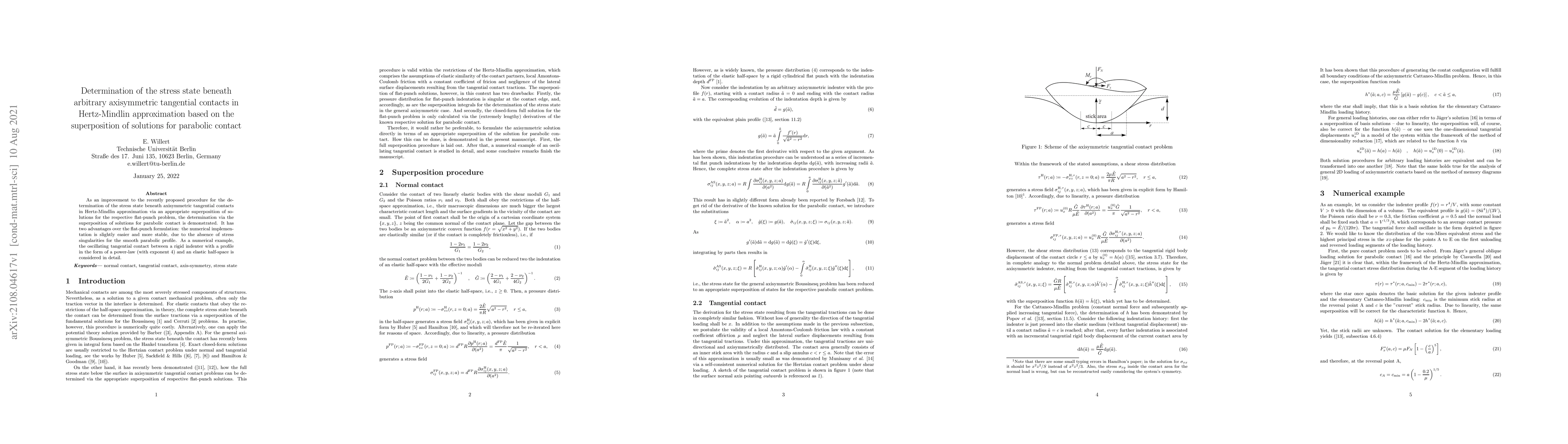 As an improvement to the recently proposed procedure for the determination of the stress state beneath axisymmetric tangential contacts in Hertz-Mindlin approximation via an appropriate superposition of solutions for the respective flat-punch problem, the determination via the superposition of solutions for parabolic contact is demonstrated. It has two advantages over the flat-punch formulation: the numerical implementation is slightly easier and more stable, due to the absence of stress singularities for the smooth parabolic profile. As a numerical example, the oscillating tangential contact between a rigid indenter with a profile in the form of a power-law (with exponent 4) and an elastic half-space is considered in detail.