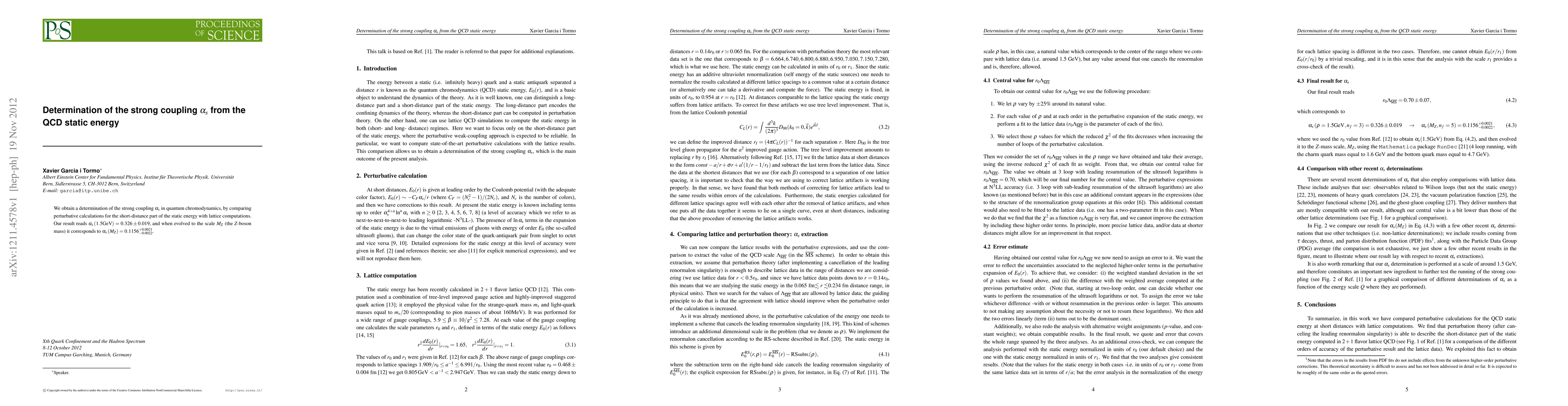 We obtain a determination of the strong coupling alpha_s in quantum chromodynamics, by comparing perturbative calculations for the short-distance part of the static energy with lattice computations. Our result reads alpha_s(1.5GeV)=0.326\pm0.019, and when evolved to the scale M_Z (the Z-boson mass) it corresponds to alpha_s(M_Z)=0.1156^{+0.0021}_{-0.0022}.