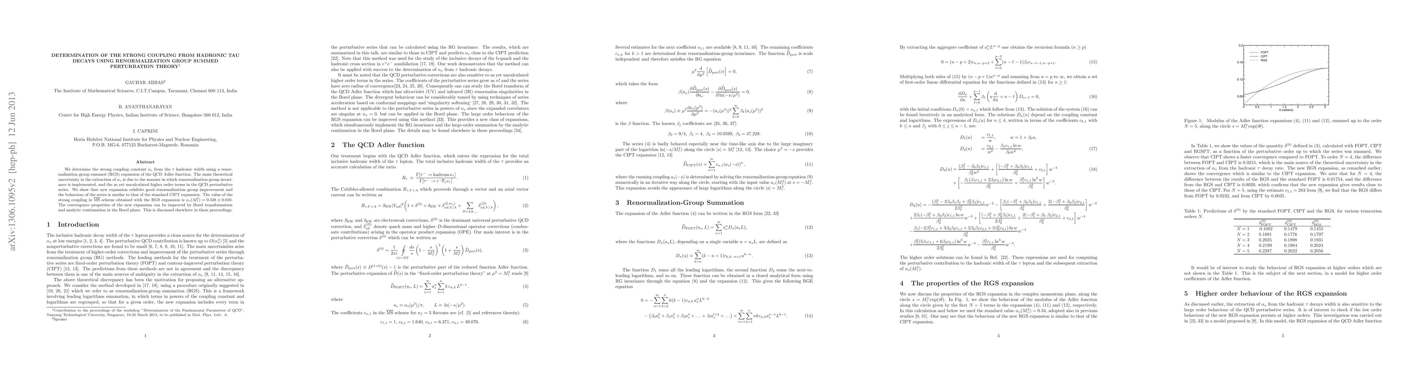 This paper determines the strong coupling constant \(\alpha_s\) from hadronic tau decays using a novel renormalization group summed (RGS) expansion of the QCD Adler function. The authors find \(\alpha_s(M_\tau^2) = 0.338 \pm 0.010\) in the \(\bar{\rm MS}\) scheme, showing improved convergence properties compared to standard methods.