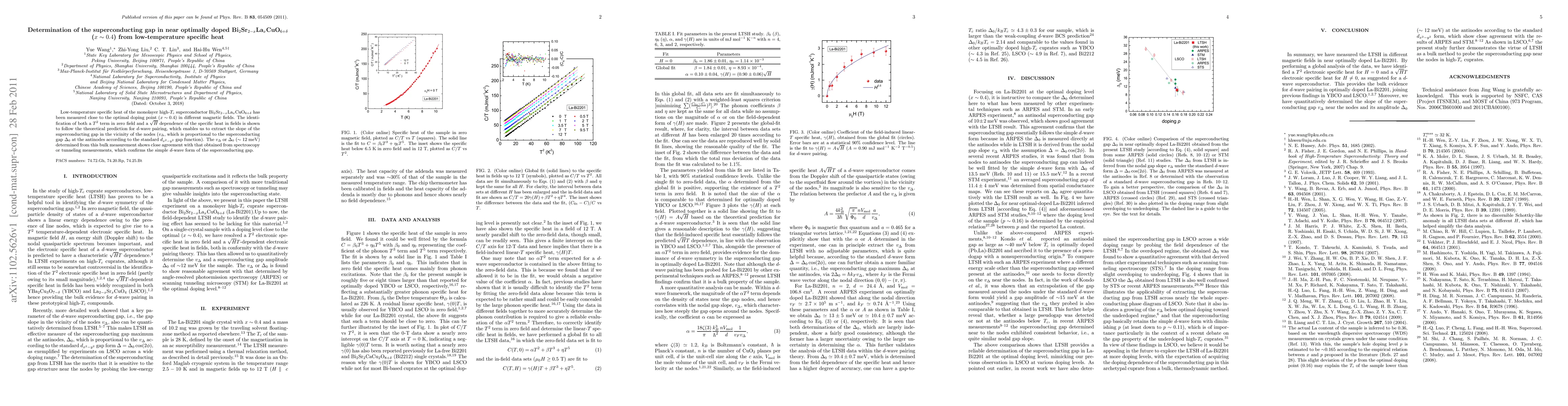 This study measures the low-temperature specific heat of near optimally doped Bi_2Sr_{2-x}La_xCuO_{6+\delta} to determine the superconducting gap, revealing a T^2 term and a \sqrt{H} dependence indicative of d-wave pairing. The extracted gap value (~12 meV) aligns with spectroscopic measurements, confirming the d-wave nature of the superconducting gap.