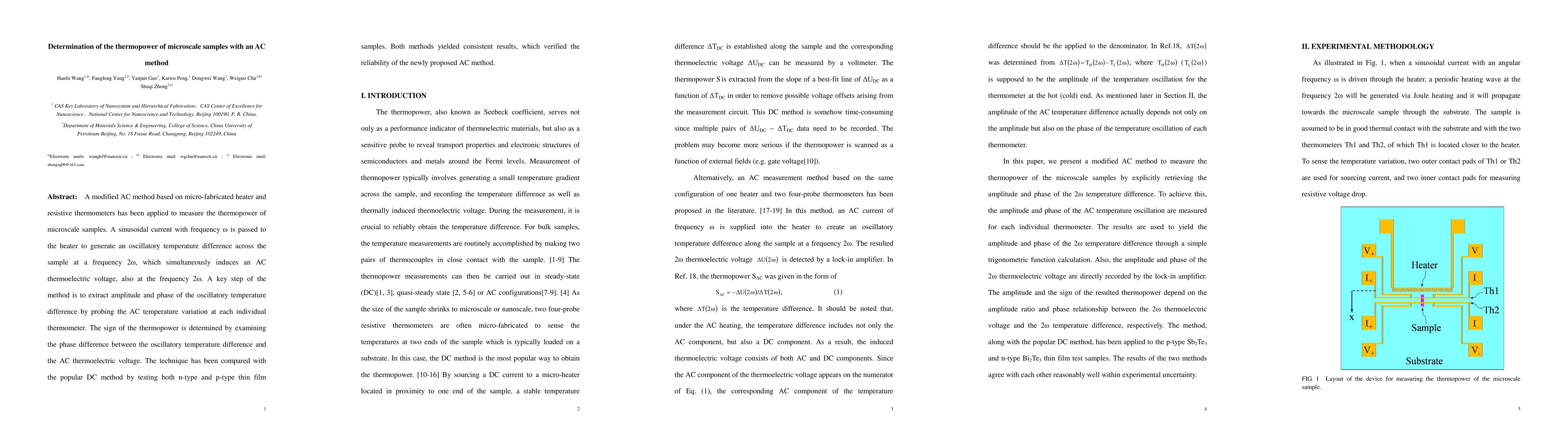 A modified AC method based on micro-fabricated heater and resistive thermometers has been applied to measure the thermopower of microscale samples. A sinusoidal current with frequency {\omega} is passed to the heater to generate an oscillatory temperature difference across the sample at a frequency 2{\omega}, which simultaneously induces an AC thermoelectric voltage, also at the frequency 2{\omega}. A key step of the method is to extract amplitude and phase of the oscillatory temperature difference by probing the AC temperature variation at each individual thermometer. The sign of the thermopower is determined by examining the phase difference between the oscillatory temperature difference and the AC thermoelectric voltage. The technique has been compared with the popular DC method by testing both n-type and p-type thin film samples. Both methods yielded consistent results, which verified the reliability of the newly proposed AC method.
