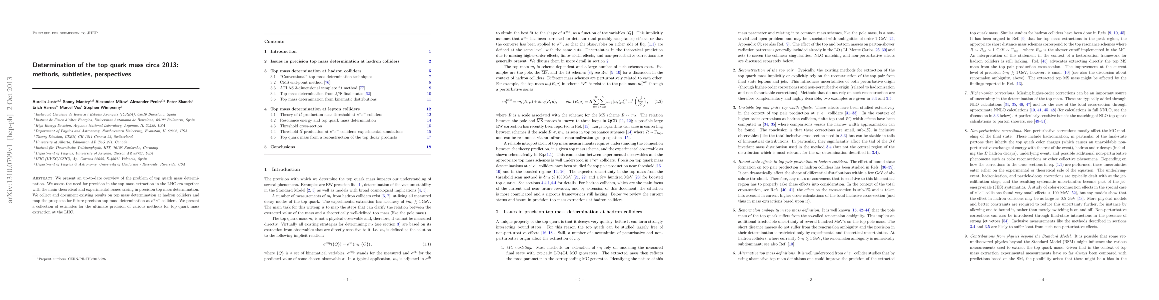 We present an up-to-date overview of the problem of top quark mass determination. We assess the need for precision in the top mass extraction in the LHC era together with the main theoretical and experimental issues arising in precision top mass determination. We collect and document existing results on top mass determination at hadron colliders and map the prospects for future precision top mass determination at e+e- colliders. We present a collection of estimates for the ultimate precision of various methods for top quark mass extraction at the LHC.