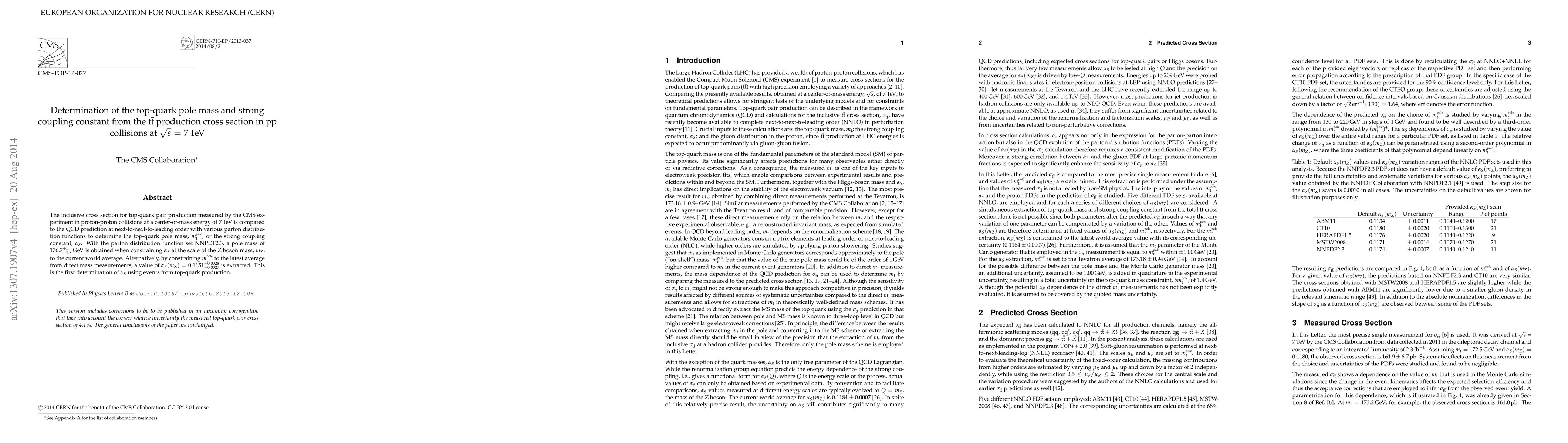 This paper determines the top-quark pole mass and the strong coupling constant from top-quark pair production cross sections in proton-proton collisions at 7 TeV using the CMS experiment. The results yield a pole mass of 176.7 GeV and a strong coupling constant of 0.1151, marking the first such determination from top-quark events.