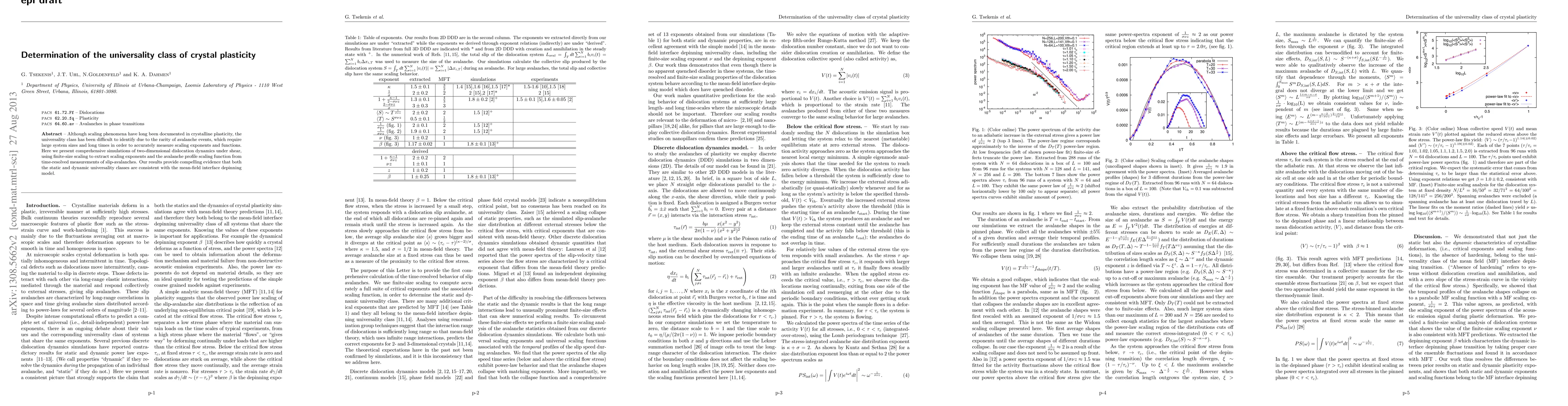 This paper presents simulations of two-dimensional dislocation dynamics to determine the universality class of crystal plasticity, finding that both static and dynamic behaviors align with the mean-field interface depinning model through finite-size scaling analysis.