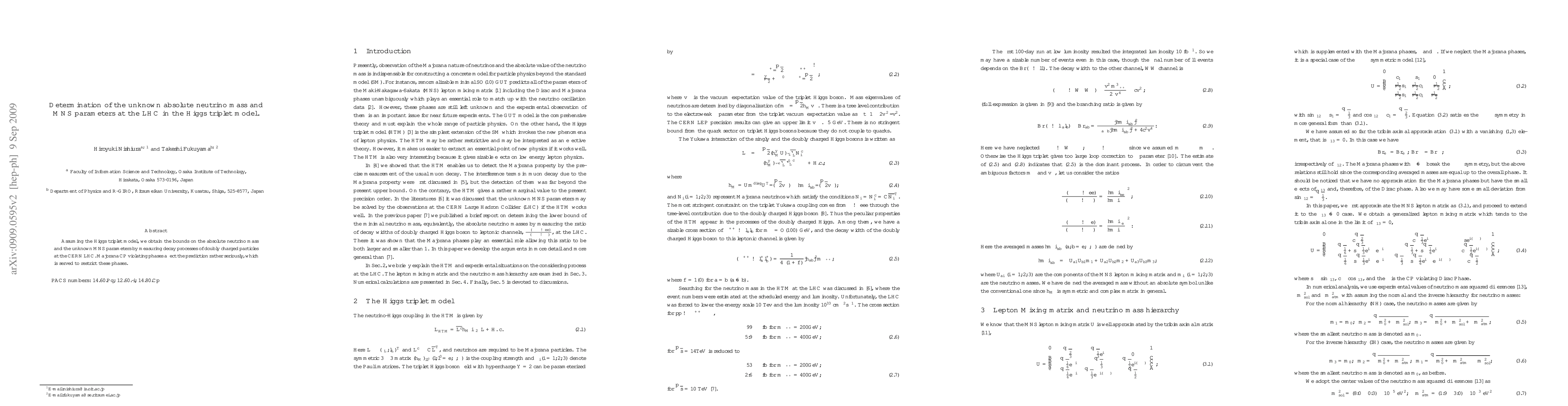 This paper determines the absolute neutrino mass and MNS parameters in the Higgs triplet model by analyzing decay processes of doubly charged particles at the LHC, providing constraints on Majorana CP violating phases. The study highlights the significant impact of these phases on the predictions.