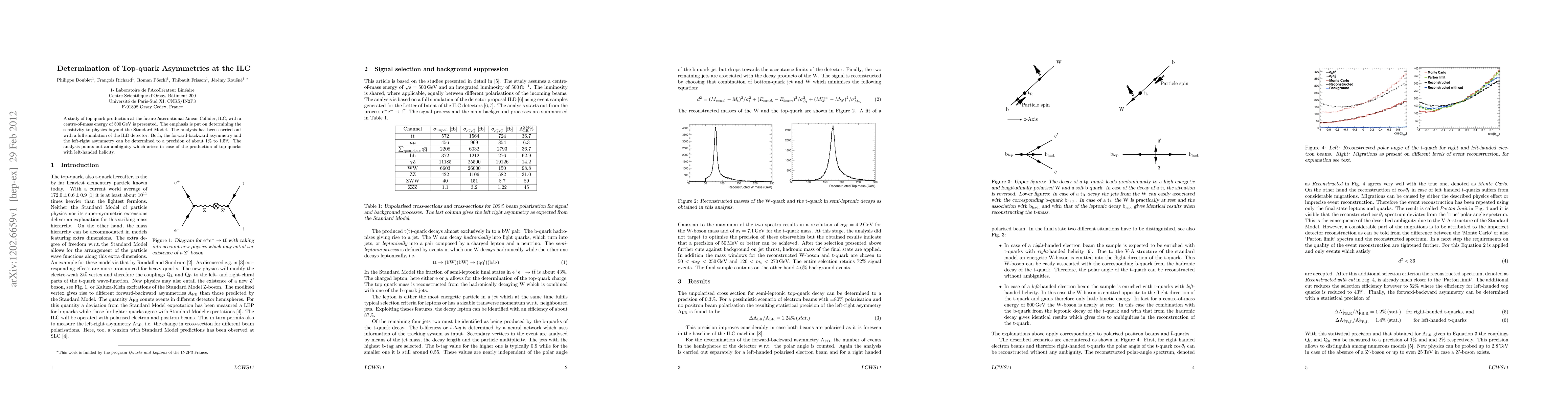 This study investigates top quark production at the International Linear Collider (ILC) with a focus on determining top-quark asymmetries to probe physics beyond the Standard Model. The analysis achieves a precision of about 1% to 1.5% for both forward-backward and left-right asymmetries, highlighting an ambiguity in left-handed helicity top-quark production.