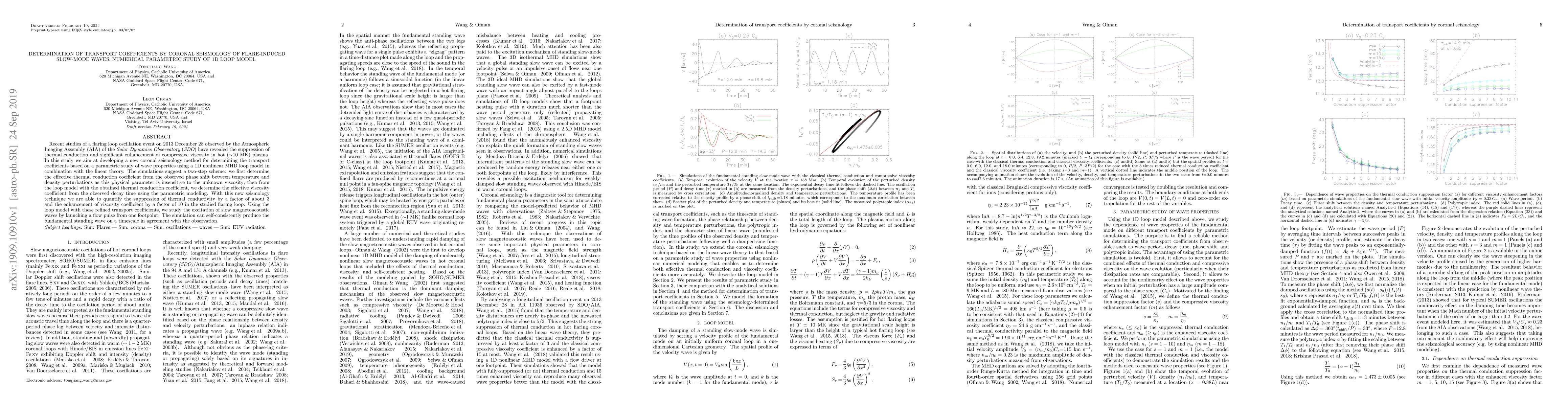 Recent studies of a flaring loop oscillation event on 2013 December 28 observed by the Atmospheric Imaging Assembly (AIA) of the Solar Dynamics Observatory (SDO) have revealed the suppression of thermal conduction and significant enhancement of compressive viscosity in hot ($\sim$10 MK) plasma. In this study we aim at developing a new coronal seismology method for determining the transport coefficients based on a parametric study of wave properties using a 1D nonlinear MHD loop model in combination with the linear theory. The simulations suggest a two-step scheme: we first determine the effective thermal conduction coefficient from the observed phase shift between temperature and density perturbations as this physical parameter is insensitive to the unknown viscosity; then from the loop model with the obtained thermal conduction coefficient, we determine the effective viscosity coefficient from the observed decay time using the parametric modeling. With this new seismology technique we are able to quantify the suppression of thermal conductivity by a factor of about 3 and the enhancement of viscosity coefficient by a factor of 10 in the studied flaring loop. Using the loop model with these refined transport coefficients, we study the excitation of slow magnetoacoustic waves by launching a flow pulse from one footpoint. The simulation can self-consistently produce the fundamental standing wave on a timescale in agreement with the observation.