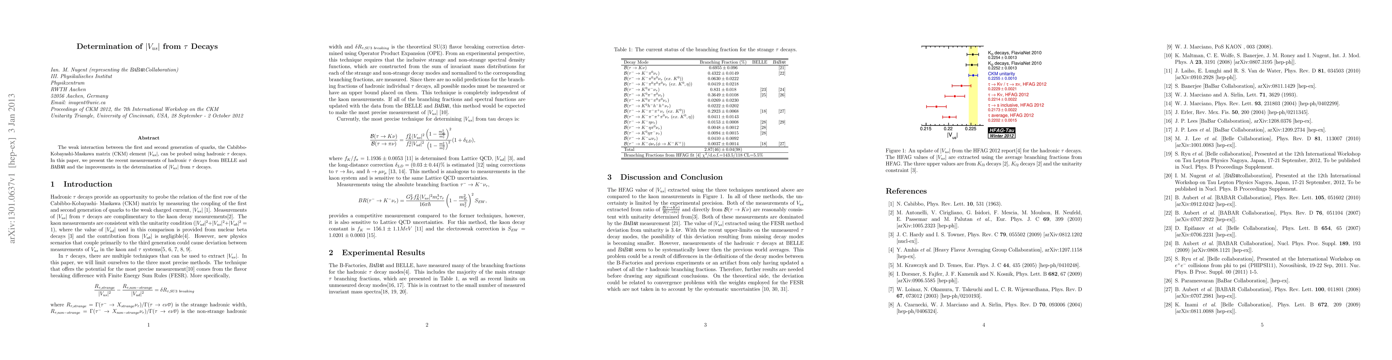 This paper reports recent measurements of hadronic tau decays from BELLE and BABAR experiments, aiming to improve the determination of the CKM matrix element |Vus|, which characterizes the weak interaction between the first and second generation of quarks. The findings contribute to a better understanding of the weak interaction dynamics.
