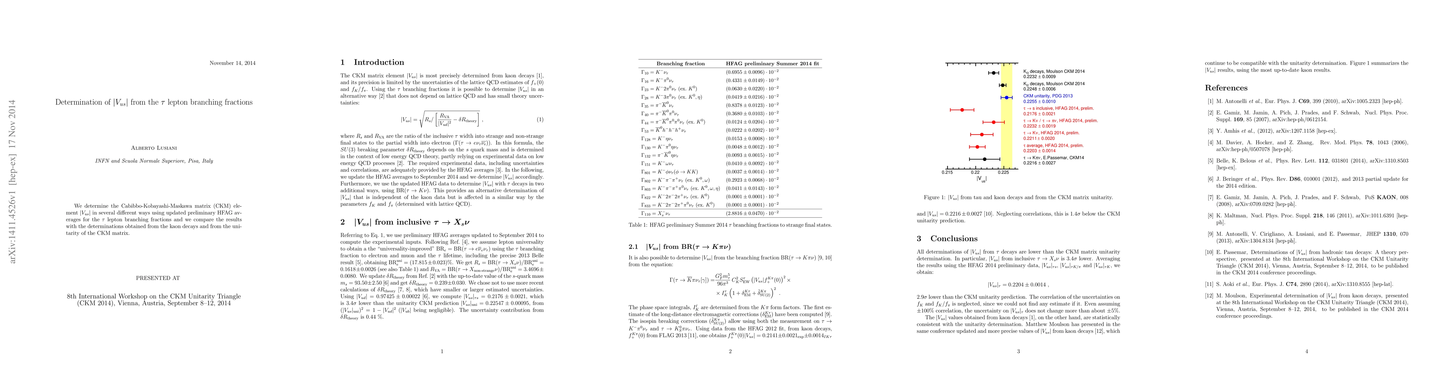 We determine the Cabibbo-Kobayashi-Maskawa matrix (CKM) element |Vus| in several different ways using updated preliminary HFAG averages for the tau lepton branching fractions and we compare the results with the determinations obtained from the kaon decays and from the unitarity of the CKM matrix.