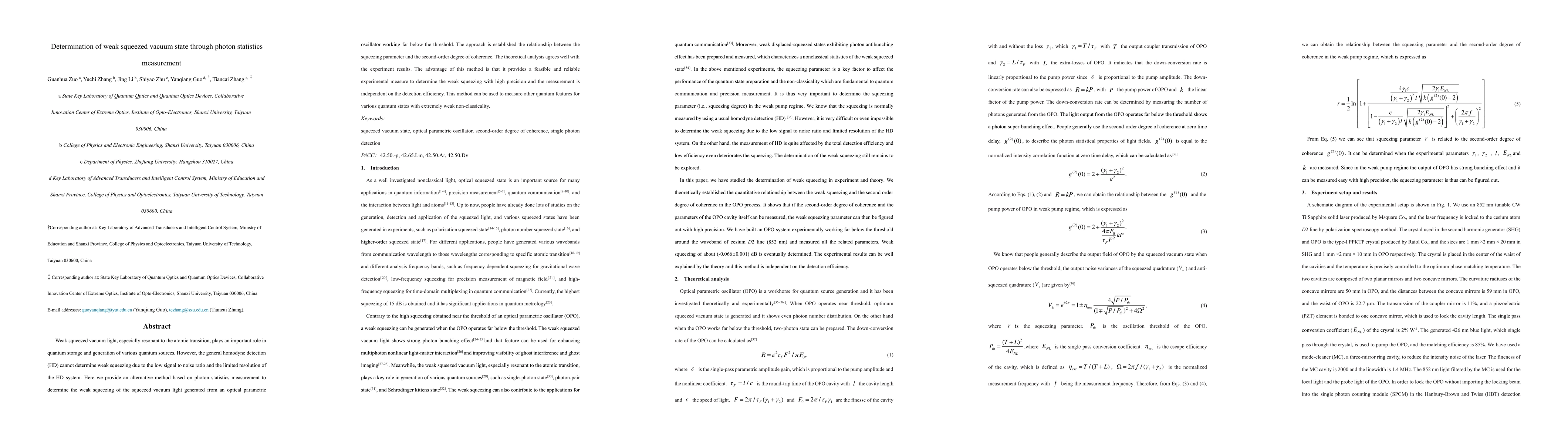This paper proposes a photon statistics measurement method to determine weak squeezed vacuum states, overcoming limitations of homodyne detection. The method correlates the squeezing parameter with the second-order degree of coherence, providing high-precision, detection-efficiency-independent measurements.