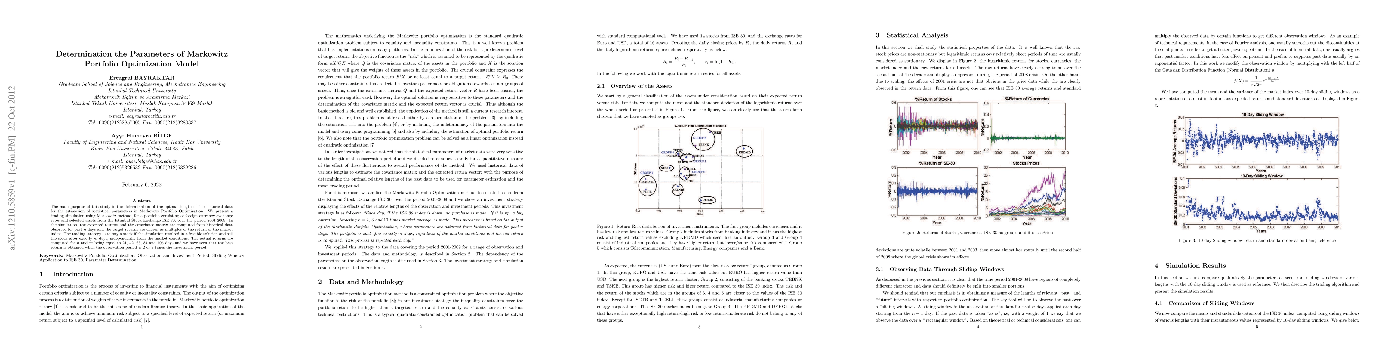 The main purpose of this study is the determination of the optimal length of the historical data for the estimation of statistical parameters in Markowitz Portfolio Optimization. We present a trading simulation using Markowitz method, for a portfolio consisting of foreign currency exchange rates and selected assets from the Istanbul Stock Exchange ISE 30, over the period 2001-2009. In the simulation, the expected returns and the covariance matrix are computed from historical data observed for past n days and the target returns are chosen as multiples of the return of the market index. The trading strategy is to buy a stock if the simulation resulted in a feasible solution and sell the stock after exactly m days, independently from the market conditions. The actual returns are computed for n and m being equal to 21, 42, 63, 84 and 105 days and we have seen that the best return is obtained when the observation period is 2 or 3 times the investment period.