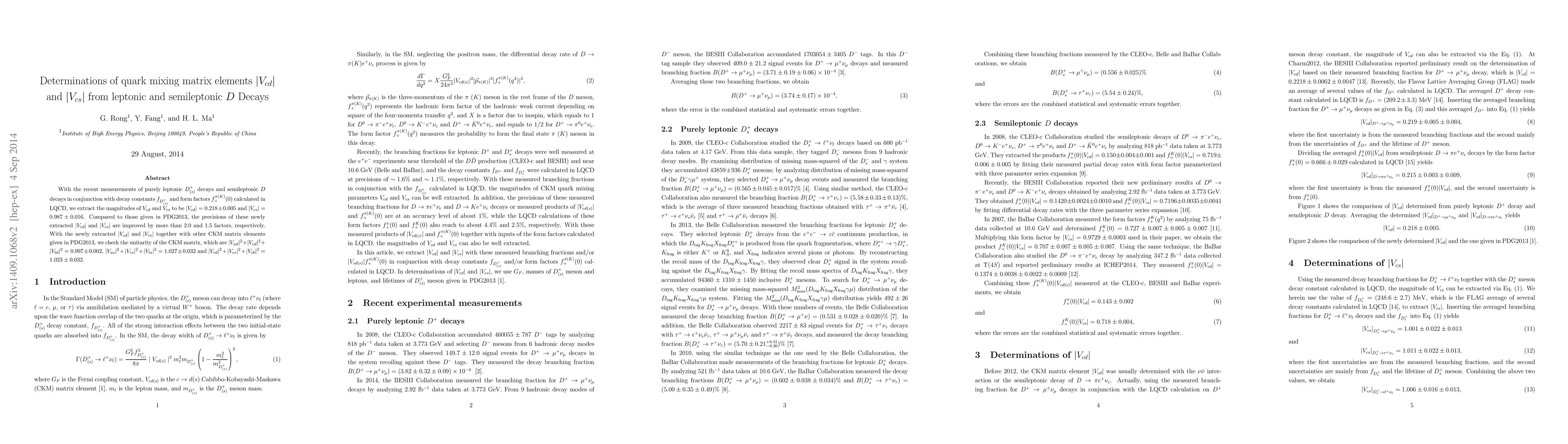 This paper determines the magnitudes of CKM matrix elements $|V_{cd}|$ and $|V_{cs}|$ from leptonic and semileptonic $D$ decays, achieving improved precision over previous PDG2013 values. The unitarity of the CKM matrix is also verified using these new values.