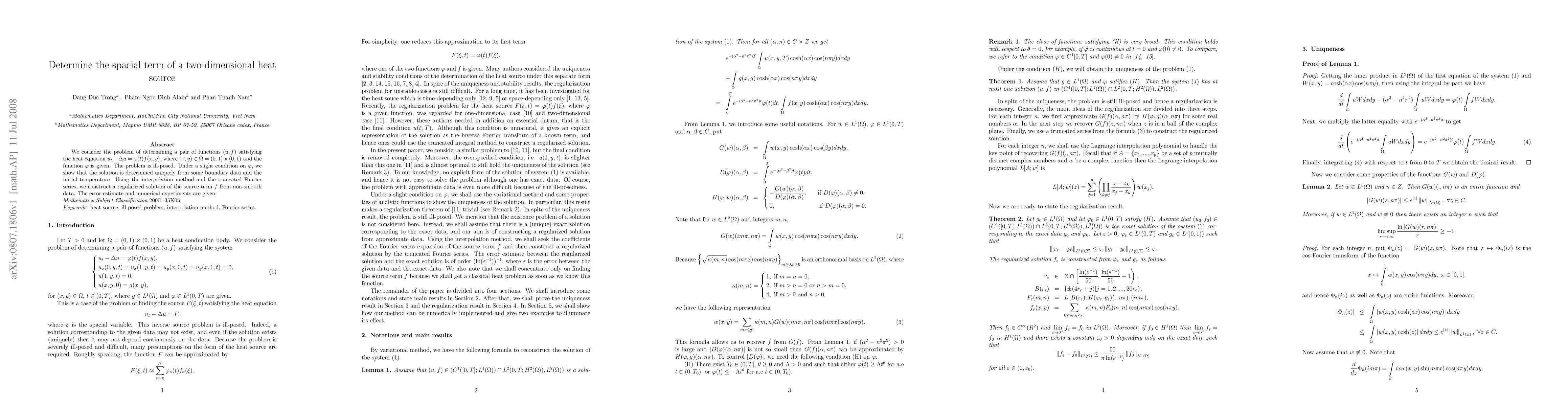 We consider the problem of determining a pair of functions $(u,f)$ satisfying the heat equation $u_t -\Delta u =\varphi(t)f (x,y)$, where $(x,y)\in \Omega=(0,1)\times (0,1)$ and the function $\varphi$ is given. The problem is ill-posed. Under a slight condition on $\varphi$, we show that the solution is determined uniquely from some boundary data and the initial temperature. Using the interpolation method and the truncated Fourier series, we construct a regularized solution of the source term $f$ from non-smooth data. The error estimate and numerical experiments are given.