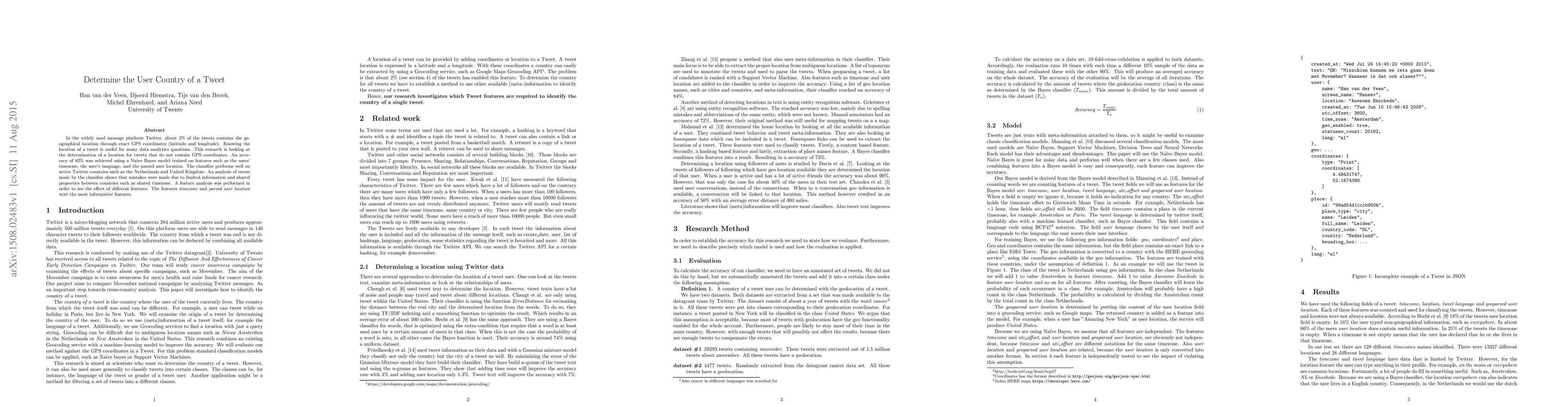 In the widely used message platform Twitter, about 2% of the tweets contains the geographical location through exact GPS coordinates (latitude and longitude). Knowing the location of a tweet is useful for many data analytics questions. This research is looking at the determination of a location for tweets that do not contain GPS coordinates. An accuracy of 82% was achieved using a Naive Bayes model trained on features such as the users' timezone, the user's language, and the parsed user location. The classifier performs well on active Twitter countries such as the Netherlands and United Kingdom. An analysis of errors made by the classifier shows that mistakes were made due to limited information and shared properties between countries such as shared timezone. A feature analysis was performed in order to see the effect of different features. The features timezone and parsed user location were the most informative features.