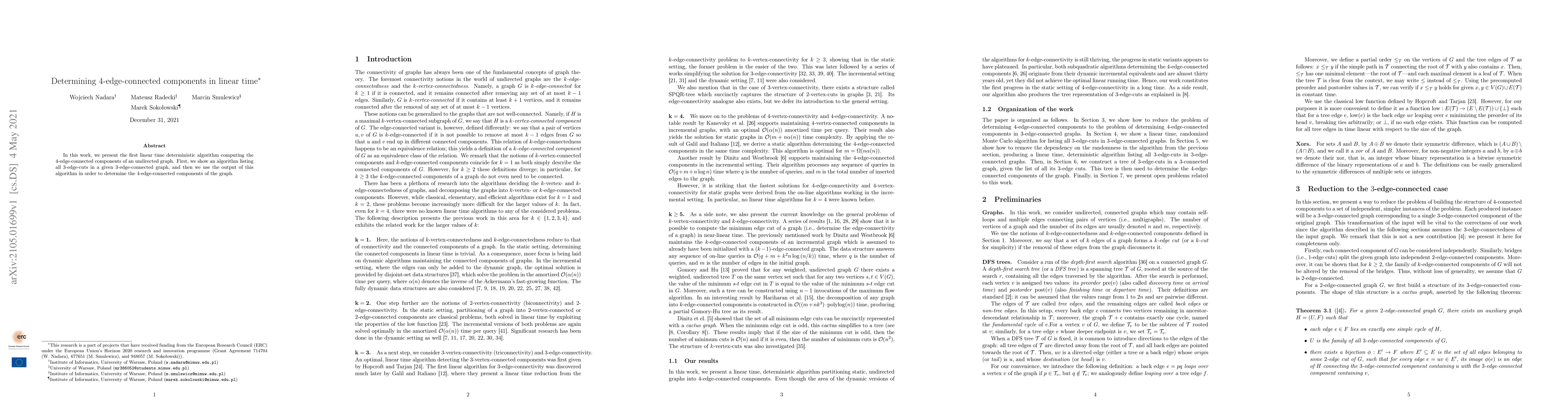 The paper presents a linear-time deterministic algorithm for determining 4-edge-connected components in a 3-edge-connected graph by first listing all 3-edge cuts using a hashtable-based approach, then leveraging the output to identify 4-edge-connected components.