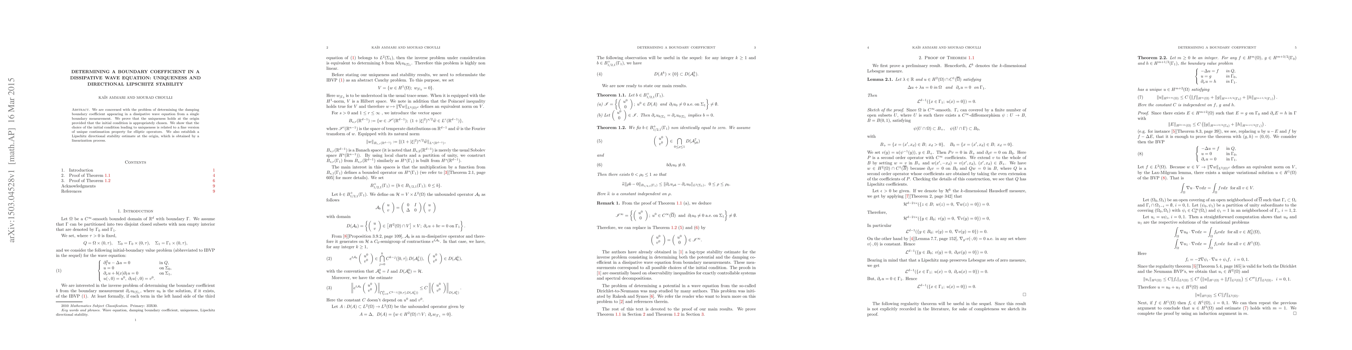 This paper investigates the determination of a damping boundary coefficient in a dissipative wave equation using a single boundary measurement. It proves uniqueness under specific initial conditions and establishes Lipschitz directional stability at the origin through a linearization process.