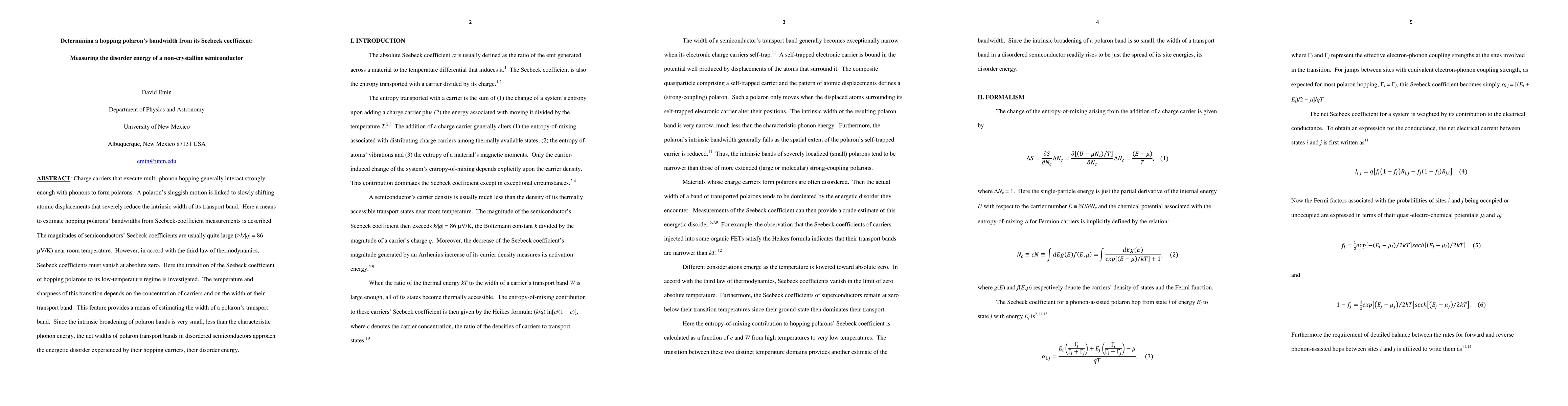 Charge carriers that execute multi-phonon hopping generally interact strongly enough with phonons to form polarons. A polarons sluggish motion is linked to slowly shifting atomic displacements that severely reduce the intrinsic width of its transport band. Here a means to estimate hopping polarons bandwidths from Seebeck-coefficient measurements is described. The magnitudes of semiconductors Seebeck coefficients are usually quite large (greater than 86 microvolts/K) near room temperature. However, in accord with the third law of thermodynamics, Seebeck coefficients must vanish at absolute zero. Here the transition of the Seebeck coefficient of hopping polarons to its low-temperature regime is investigated. The temperature and sharpness of this transition depends on the concentration of carriers and on the width of their transport band. This feature provides a means of estimating the width of a polarons transport band. Since the intrinsic broadening of polaron bands is very small, less than the characteristic phonon energy, the net widths of polaron transport bands in disordered semiconductors approach the energetic disorder experienced by their hopping carriers, their disorder energy.