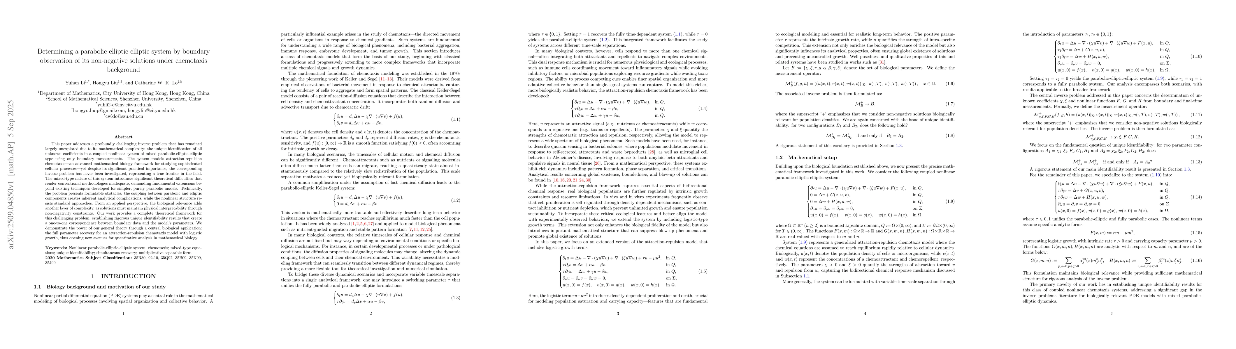 This paper addresses a profoundly challenging inverse problem that has remained largely unexplored due to its mathematical complexity: the unique identification of all unknown coefficients in a coupled nonlinear system of mixed parabolic-elliptic-elliptic type using only boundary measurements. The system models attraction-repulsion chemotaxis--an advanced mathematical biology framework for studying sophisticated cellular processes--yet despite its significant practical importance, the corresponding inverse problem has never been investigated, representing a true frontier in the field. The mixed-type nature of this system introduces significant theoretical difficulties that render conventional methodologies inadequate, demanding fundamental extensions beyond existing techniques developed for simpler, purely parabolic models. Technically, the problem presents formidable obstacles: the coupling between parabolic and elliptic components creates inherent analytical complications, while the nonlinear structure resists standard approaches. From an applied perspective, the biological relevance adds another layer of complexity, as solutions must maintain physical interpretability through non-negativity constraints. Our work provides a complete theoretical framework for this challenging problem, establishing rigorous unique identifiability results that create a one-to-one correspondence between boundary data and the model's parameters. We demonstrate the power of our general theory through a central biological application: the full parameter recovery for an attraction-repulsion chemotaxis model with logistic growth, thus opening new avenues for quantitative analysis in mathematical biology.