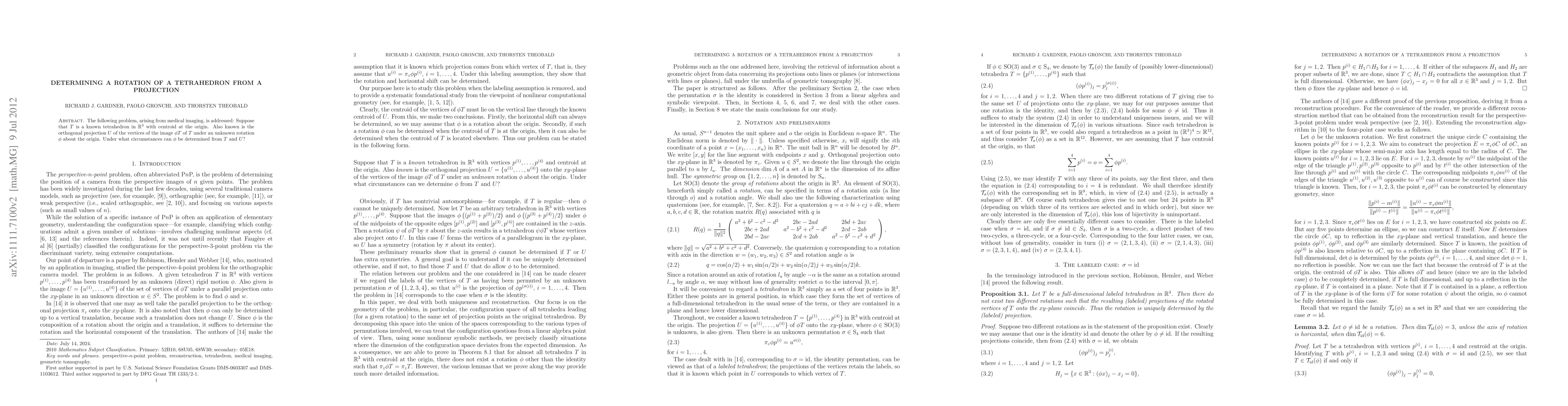 The following problem, arising from medical imaging, is addressed: Suppose that $T$ is a known tetrahedron in $\R^3$ with centroid at the origin. Also known is the orthogonal projection $U$ of the vertices of the image $\phi T$ of $T$ under an unknown rotation $\phi$ about the origin. Under what circumstances can $\phi$ be determined from $T$ and $U$?